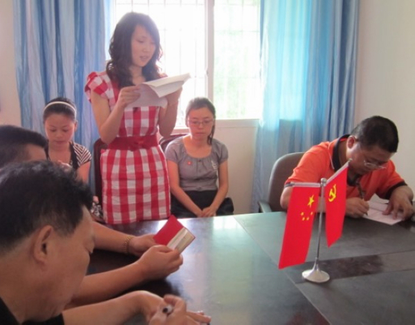 会上,党支部组织党员温习了党章,要求全体党员同志充分发挥先锋模范带头作用,创优争先,向党的90岁生日献礼。入党积极分子杨铂娇、蒲晓霞同志郑重向组织提交了入党申请,并获全票通过为预备党员,热烈祝贺的掌声把会议推向高潮。(张运明)
