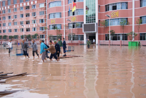 2011年9月18日,渠江水位急剧上涨,发生特大洪水,水位上涨25.36米,渠县遭受了百年未见的特大洪灾。渠县报恩、文崇、三汇、土溪、渠江镇等60多个乡镇136.5万人都不同程度遭受了史无前例的巨大损失。位于风景秀丽、依山傍水渠江之滨的渠县艺烽双语学校也未能躲过一劫,教学大楼1-3楼、多媒体教室、师生宿舍、食堂等同样遭受洪水洗劫,损失惨重,连超市里所有的零吃和方便面也全部免费发放给了被洪水围困在学校的孩子们。然而,灾难压不倒坚强的艺烽人,他们不等不靠,所有的艺烽师生团结一致、自力更生、抗灾自救。