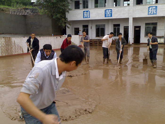 洪水过后,整个校园一片狼籍,到处都是洪水带来的衣物,木块,稻草,还有一片木棚瓦盖,厚厚的淤泥可以掩没半个小腿。学校领导和老师们没有被眼前惨状吓倒,校长叶建国身先士卒带领全体老师马上投入到清淤工作中。学校买来柴油机和管子,从附近的河里抽上水来边冲,边扫,边洗。学校在职教师一个也不拉下,支教老师也专程从达县坐火车赶回学校,大家都积极地投入到这项工作中来。前面一组教师先用铁铲铲掉厚厚的淤泥,后面一组教师再用水枪冲,再后面一组就用扫把扫,最后面一组教师就清洗桌椅、门窗、地面。大家配合默契,情绪高昂,分工合作,共同劳动。通过领导和全体教师的共同努力,辛苦劳作。学校又恢复了美丽的花园式校园,学生在最短的时间内又可以回到学校上学了。
