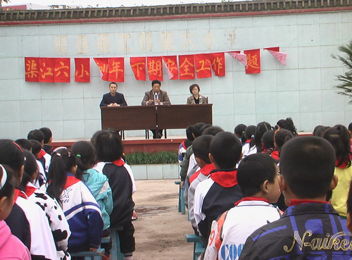 2011年11月8日,渠江六小召集全体师生在操场隆重召开“安全工作”主题会。分管安全副校长袁英对我校的安全工作进行了专门部署,对安全常识从室内活动、课间活动、大型活动、交通安全、防火、用电、防毒等七个方面进行防范教育。全校师生进一步掌握了安全防范知识,增强了安全防范观念,从而提高了安全防范意识。