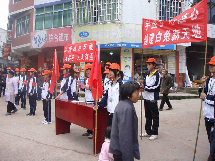 白兔学校环治工作再创新招 字体:大 小 打印 关闭本页 作者: 来源:本站原创 发布时间:2011-11-23 10:22:24 点击数: 扫一扫下载渠县网APP 分享 分享到: 白兔学校历来非常重视环境综合治理工作,学校及周边的环境非常整洁。为配合渠县城乡环境综合治理工作,对广大居民朋友起到一个提醒和警示的作用,学校再出新招,由学校团支部、少先队大队部发出倡议书,倡议广大居民朋友共同爱护家园环境。11月23日上午,学校爱护环境志愿者走上街头,积极向老百姓宣传介绍环保知识、发放倡议书、朗诵城乡环境综合治理 “三字经”。为建设文明、整洁、美好的家园而添砖加彩。受到乡党委、政府的肯定和群众的好评。(刘 川)