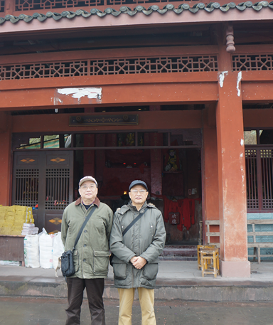 2012年12月于桑长子于晋(右)、次子于安琳返乡认祖归宗,重访“高思寺”旧址,这是在高思寺旧址上重建的供老百姓烧香拜佛堂前兄弟俩的合影