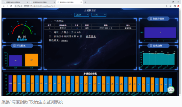 “你镇最近信访数量较多,平台向你镇发出预警,请认真研究剖析,采取有效措施,做好重要节点信访维稳工作。”2022年3月,渠县涌兴镇收到了“清廉宕渠”指数监测平台发来的预警信息。