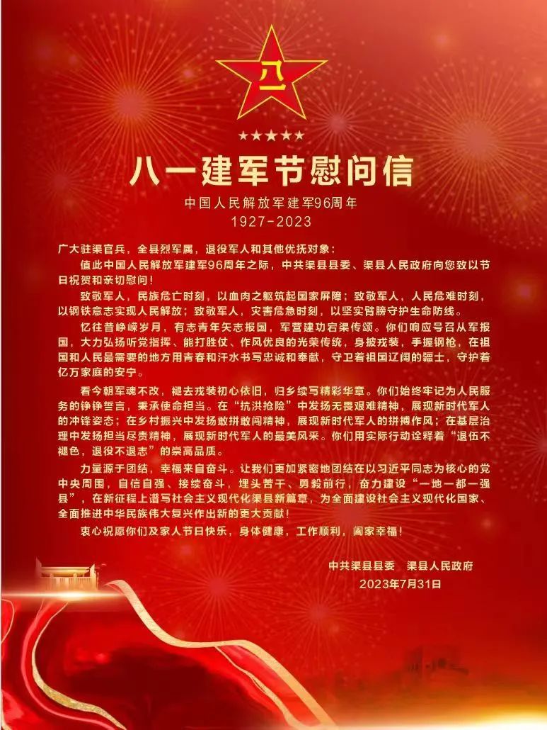 值此中国人民解放军建军96周年之际,中共渠县县委、渠县人民政府向您致以节日祝贺和亲切慰问!