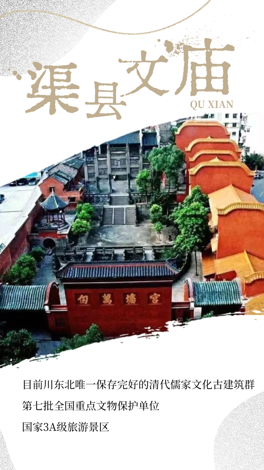创建天府旅游名县|渠县文庙:在历史的长河中,它执着地承载着渠县人的文化自信 字体:大 小 打印 关闭本页 作者:渠县融媒体中心 来源:文旅渠县 发布时间:2023-08-21 11:54:34 点击数: 扫一扫下载渠县网APP 分享 分享到: 渠县文庙位于渠江镇和平街,占地面积5711平方米,依山取势,建筑群中轴分明,左右对称,体现出儒家中正中和,不偏不倚的境界。渠县文庙始建于宋嘉定以前,在风雨洗礼中,它几迁几毁,几毁几建。现在的渠县文庙建于道光元年,历经沧桑,仍旧气势雄伟。https://mp.weixin.qq.com/s/gFoXOR83DXYnqCC5EA0_Dg