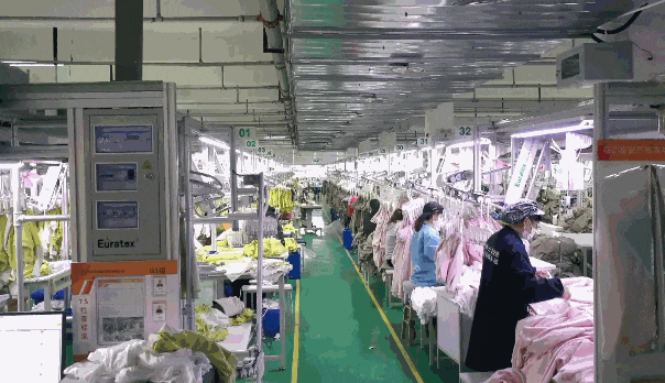 从棉纱、织布、印染到成衣环节,模版缝制区工人们只需将布料放在指定位置,机器就会进行自动缝纫。