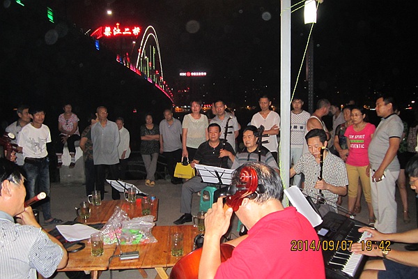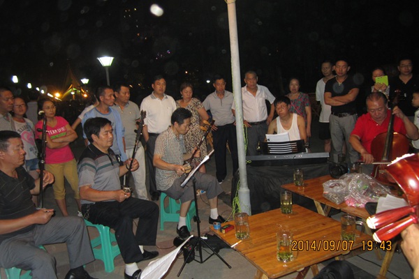 9月7日晚,渠县东城半岛乐队举办了小型音乐会。乐队和歌手20余人在滨河路演奏《喜洋洋》、《金蛇狂舞》等传统经典曲目,吸引了不少市民驻足欣赏。
