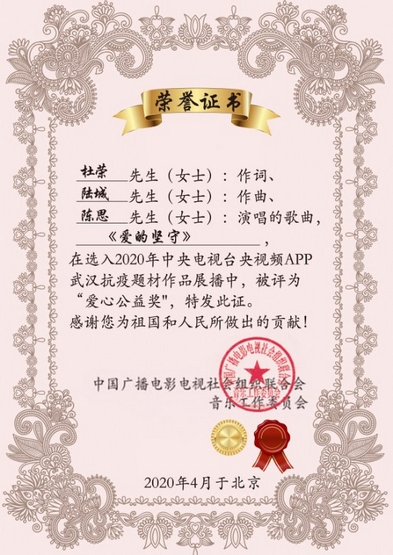 日前,由渠县诗歌协会会长杜荣作词、渠县籍著名作曲家陆城作曲、青年女高音独唱演员陈思演唱的抗疫歌曲《爱的坚守》,在选入2020年中央电视台央视频APP武汉抗疫题材作品展播中,被中国广播电影电视组织联合会音乐工作委员会评为“爱心公益奖”。