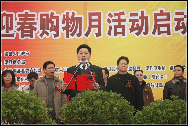 为进一步扩大内需,促进消费,搞活流通,繁荣经济。2009年1月5日,渠县万兴广场花团锦簇,锣鼓喧天,烟花齐放,异常热闹。由渠县人民政府主办的“中国黄花之乡·渠县2009迎春购物月活动启动仪式”正式拉开了“营造环境,促进消费,欢乐祥和过新年”的购物月序幕。