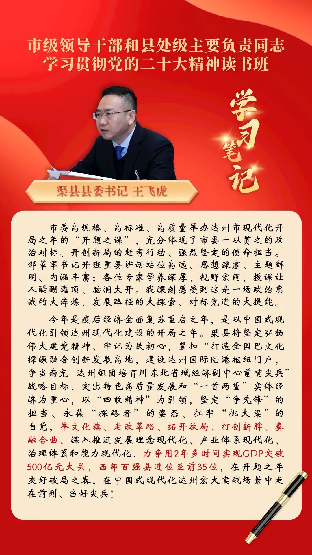 【聚焦达州“读书班”】渠县县委书记王飞虎:以“四敢”精神为引领 在中国式现代化达州宏大实践场景中走在前列、当好尖兵!