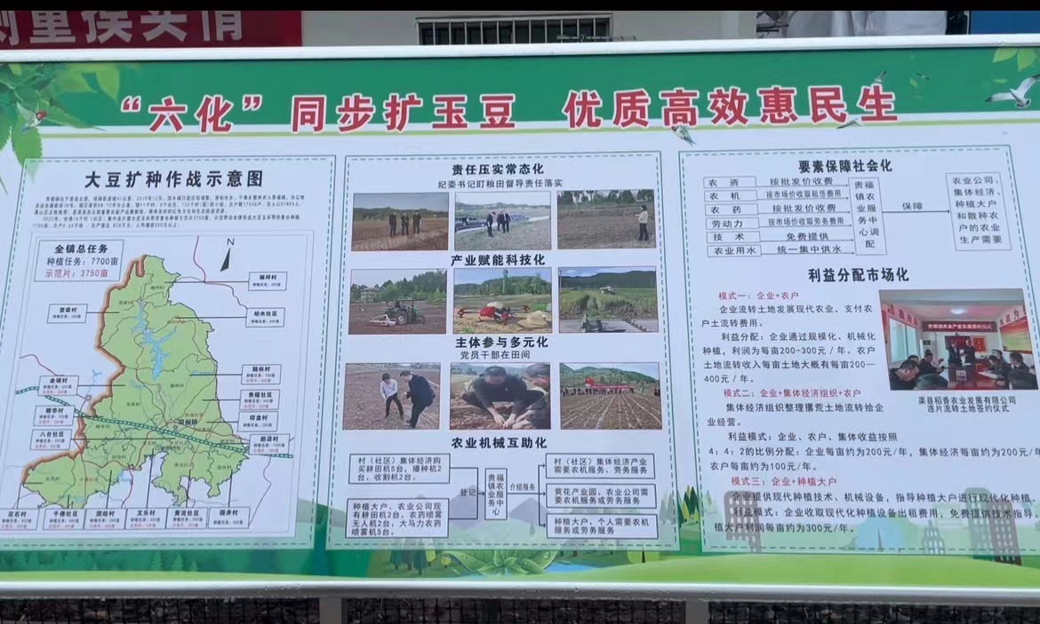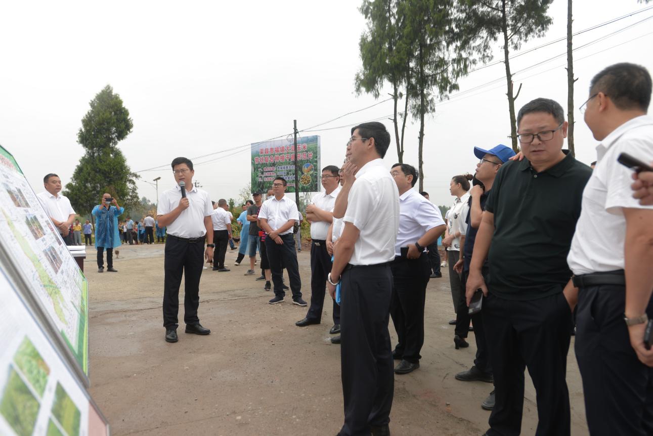 达州市人民政府副秘书长王鸿钊在致辞中指出我市在大豆玉米带状复合种植方面取得的成就,并对下一步推动大豆玉米带状复合种植面积无人机遥感核查工作提出了新的要求。渠县县委副书记王剑从提高站位强推进、挖掘潜力扩播面、加大投入强保障、压实责任严考核四个方面介绍了渠县推动大豆玉米复合种植的高效做法。在展板展示环节,我镇党委书记苟佳向在场的领导同事讲解了我镇以“六化”为切入点扩种玉豆的特色亮点。