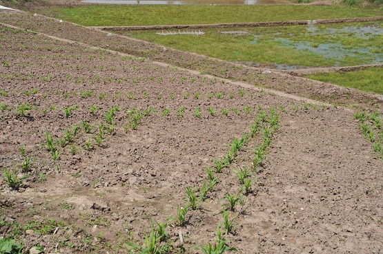 翻新的撂荒地上,玉米苗由黄转绿,颜色渐变,处处春意盎然。