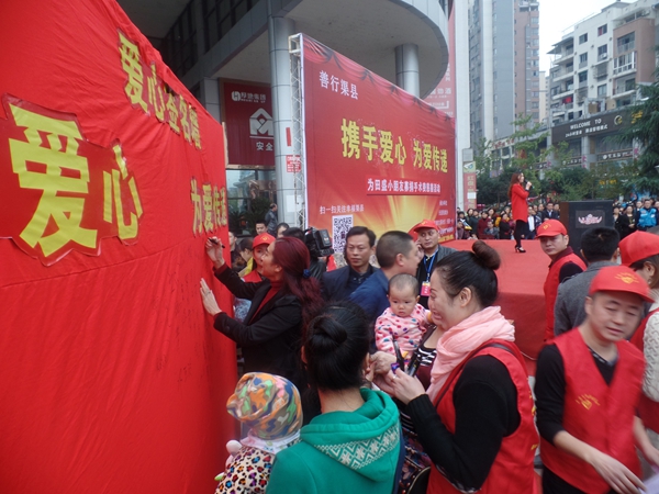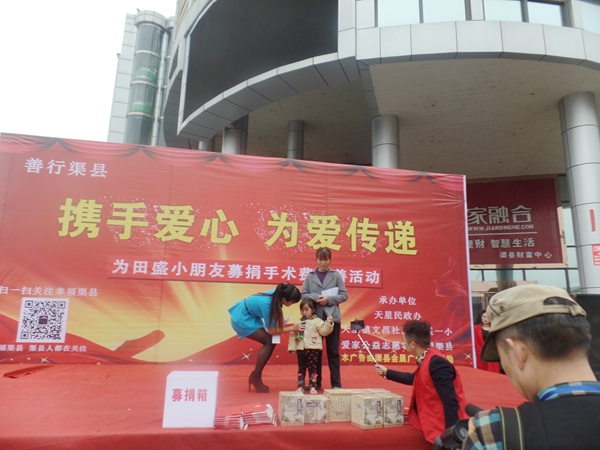 2015年11月3日上午,为救助文昌社区五组四岁小女孩田盛,天星镇民政办、镇网格办、文昌社区、天星一小、渠县爱家志愿者协会在东城半岛河边广场联合组织大型公益募捐活动。