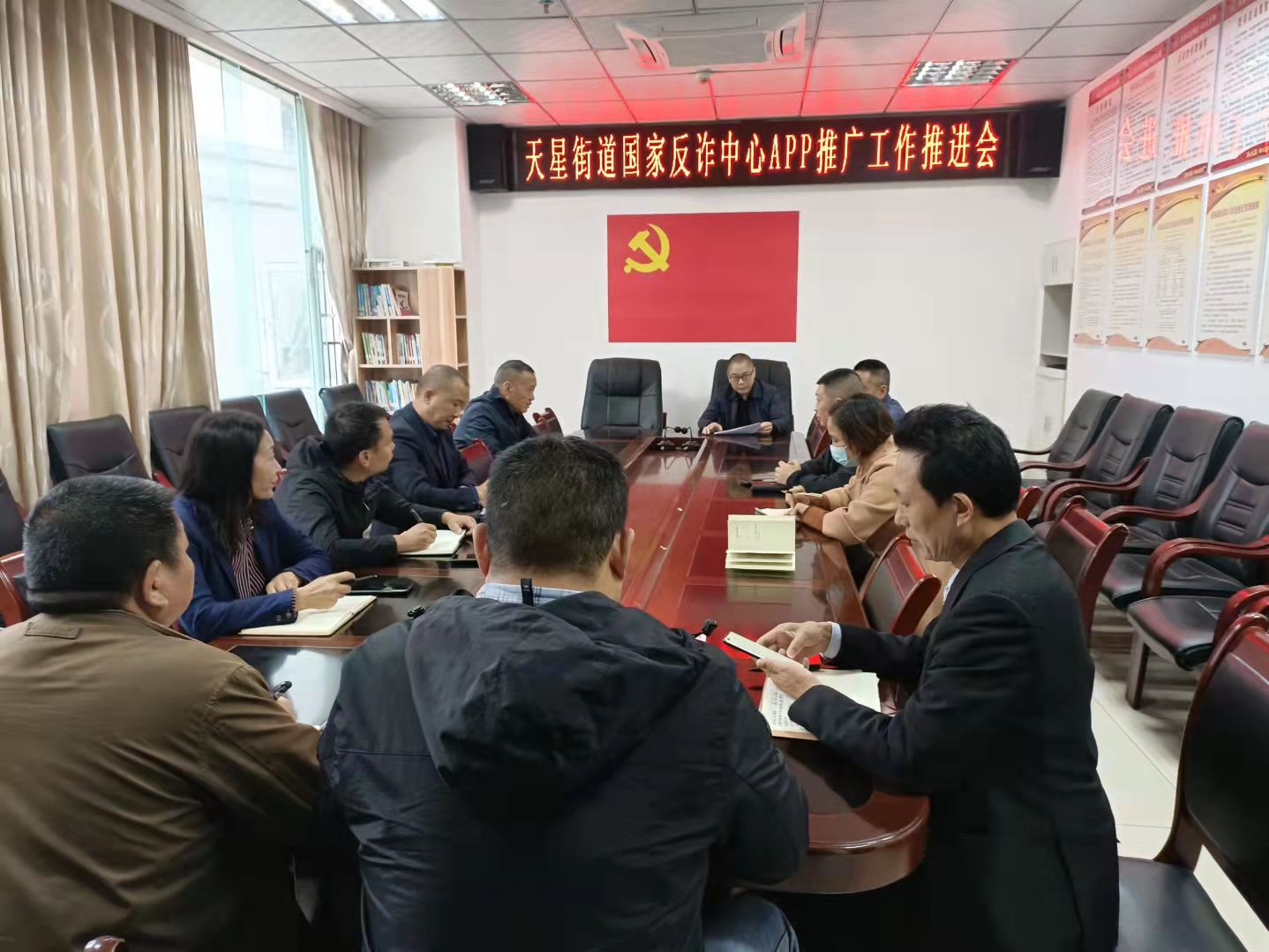 2021年10月16日天星街道组织召开国家反正中心APP推广工作推进会,会议由街道分管反诈工作的熊运国副主任主持,各村(社区)书记参加会议。