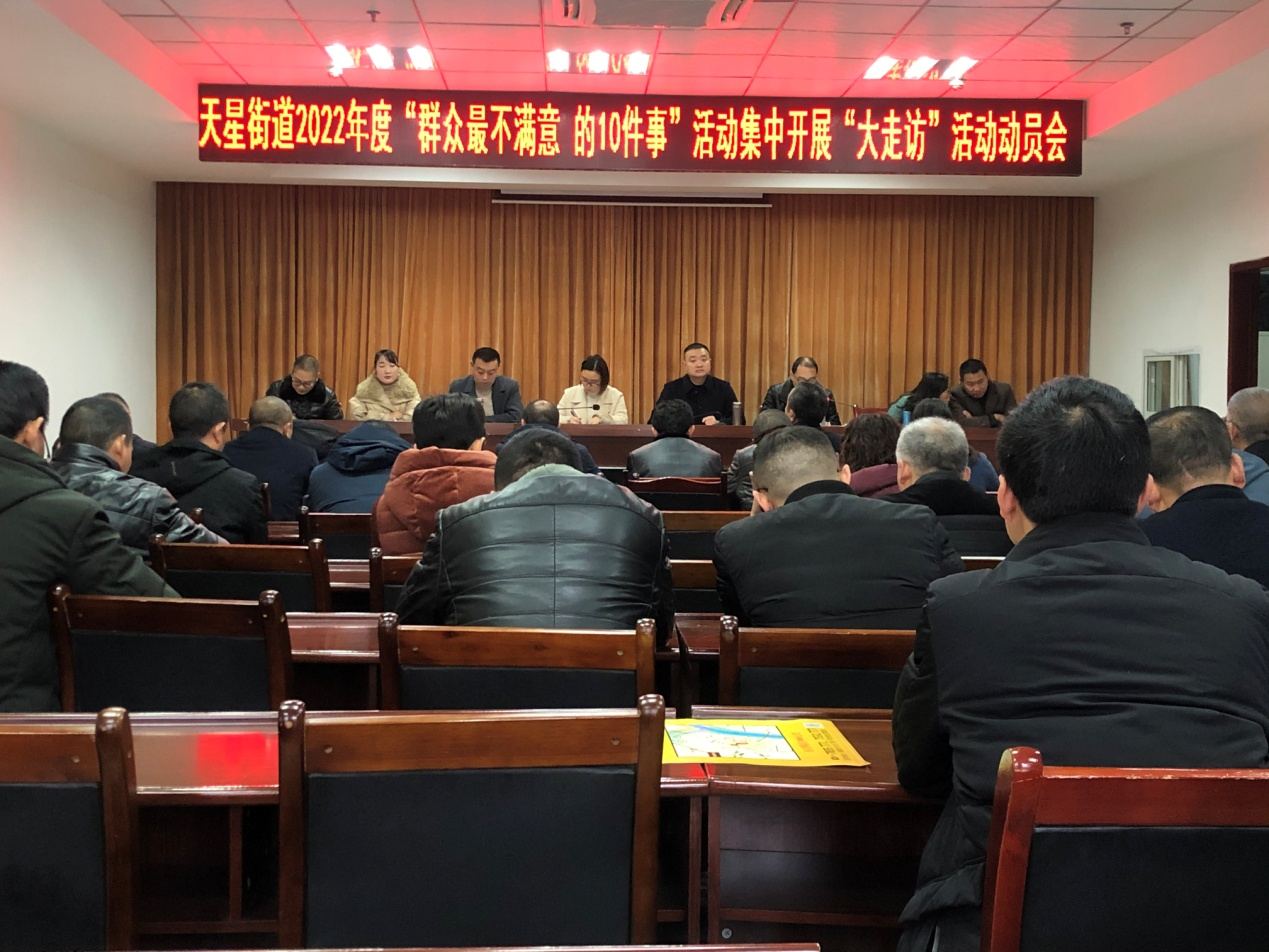 为将2022年度整治“群众最不满意的10件事”活动走深走实,切实了解和收集群众最关心,最希望解决的急事、难事、愁事、期盼之事。近日,天星街道决定集中开展“大走访”活动,组织召开天星街道整治“群众最不满意的10件事活动”集中开展“大走访”活动动员会,安排部署“大走访”活动相关事宜。