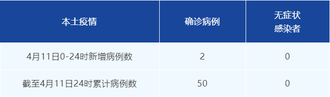 4月11日0-24时,成都市新增本土确诊病例2例,无新增本土无症状感染者。截至4月11日24时,成都市本轮疫情累计报告本土确诊病例50例。
