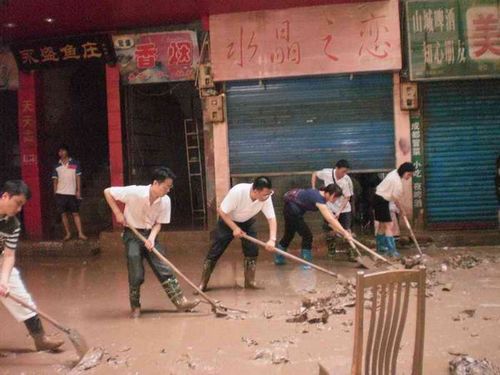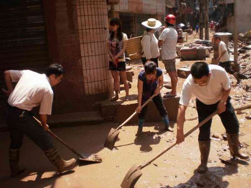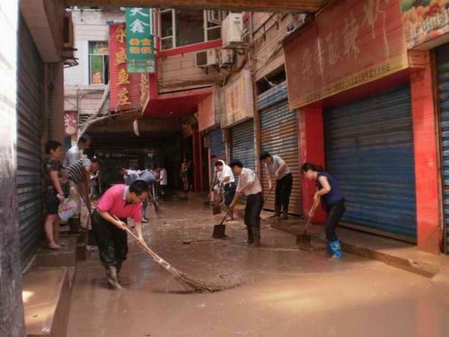 在清淤现场,机关干部们有的穿着水靴、有的穿着拖鞋,有的用铁锹将地面的淤泥往外铲、清理被杂物堵塞的下水道,有的用扫帚把污水向外清扫,捡拾水面漂浮的垃圾。现场一片热火朝天的景象。洪水一点一点的消退,街面一点一点的恢复了往日的整洁。