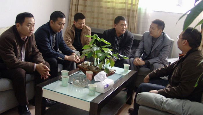吴强(右三)与土溪镇党委书记吴燕(右二)交换工作意见