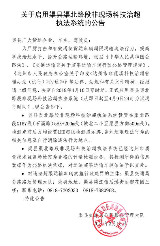 关于启用渠县渠北路段非现场科技治超执法系统的公告 字体:大 小 打印 关闭本页 作者:县路政大队 来源:本站原创 发布时间:2019-03-14 14:40:23 点击数: 扫一扫下载渠县网APP 分享 分享到: