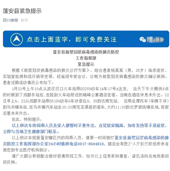 根据蓬安县新型冠状病毒感染的肺炎防控工作指挥部发布一则紧急提示:患者杨某某(男,25岁)已确诊为新型冠状病毒感染的肺炎,曾于1月22日10:30在马市铺汽车站乘坐南充到渠县的客车。我县防控指挥部采取紧急措施寻找同行人,截止1月30日14时,已对以上紧急提示中乘坐从马市铺汽车站10:30发出的南充至渠县客车的11名我县乘客全部追踪到位,现已送至集中隔离医学观察点实施隔离医学观察。