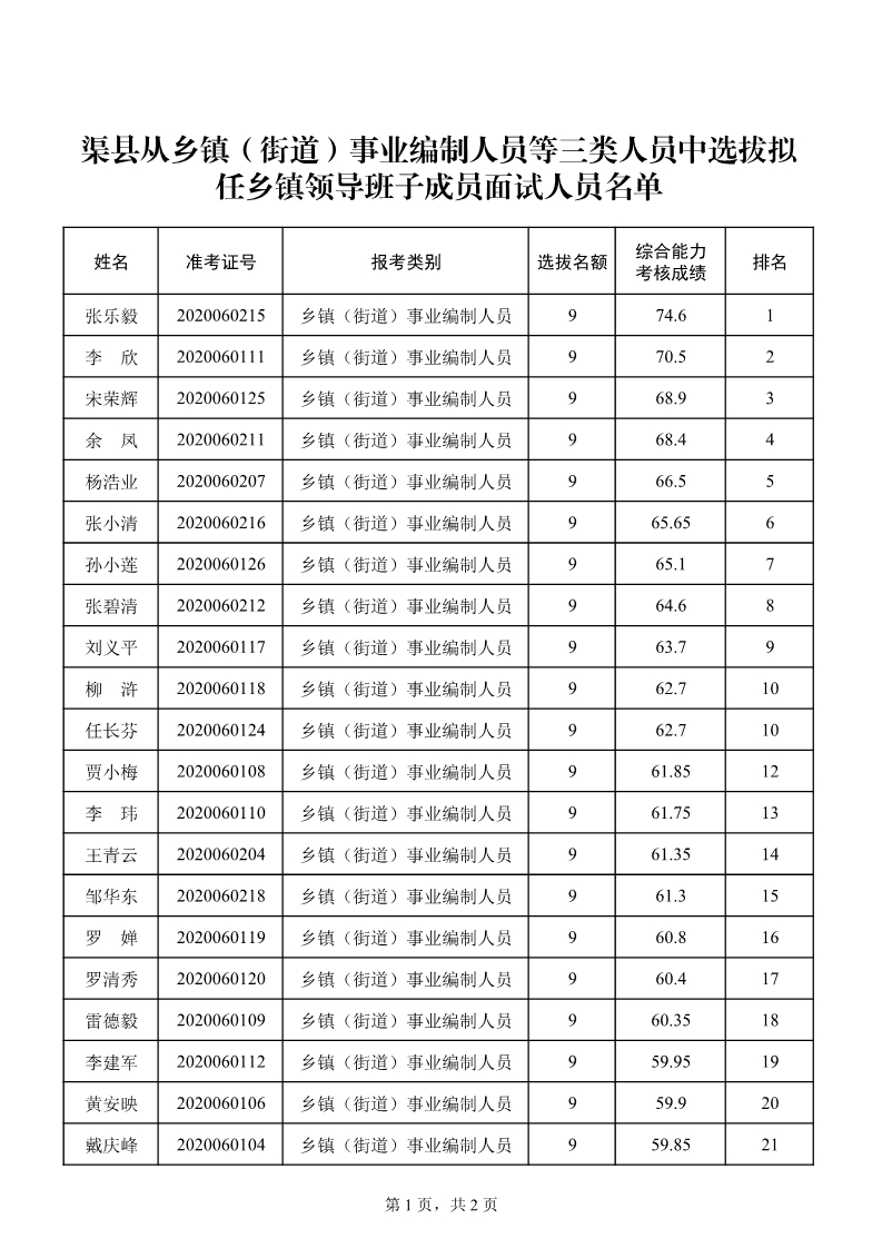中共渠县县委组织部关于从乡镇(街道)事业编制人员等三类人员中选拔拟任乡镇领导班子成员面试的 通知