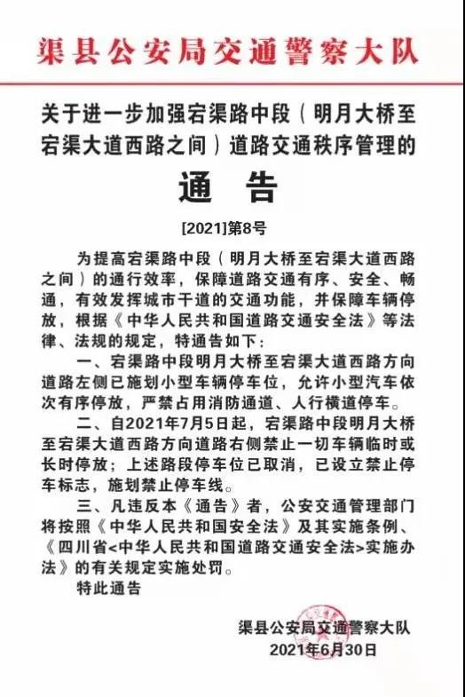 二、自2021年7月5日起,宕渠路中段明月大桥至宕渠大道西路方向道路右侧禁止一切车辆临时或长时停放;上述路段停车位已取消,已设立禁止停车标志,施划禁止停车线。