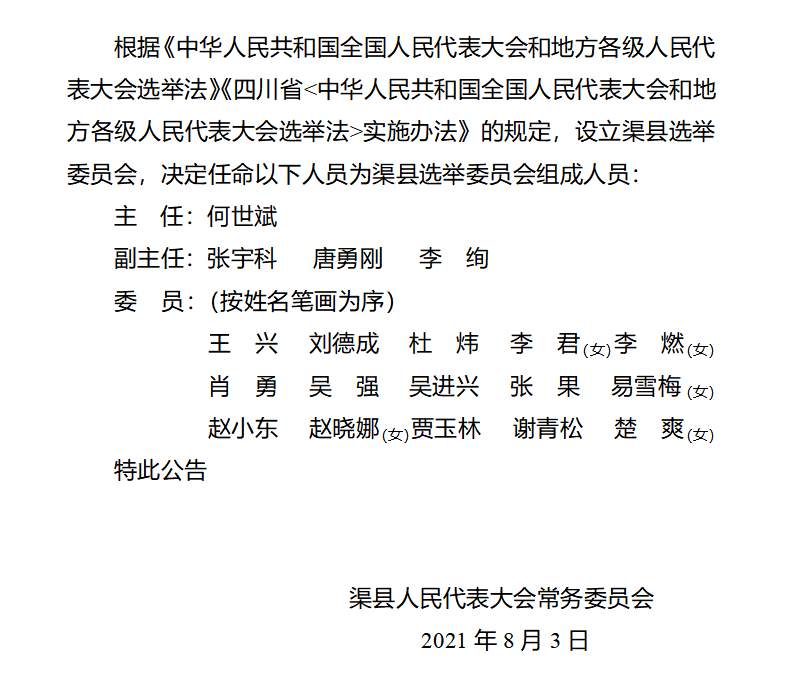 渠县人民代表大会常务委员会公告(第57号) 字体:大 小 打印 关闭本页 作者:渠县人民代表大会常务委员会 来源:本站原创 发布时间:2021-08-03 11:41:57 点击数: 扫一扫下载渠县网APP 分享 分享到: 渠县人民代表大会常务委员会公告(第57号)