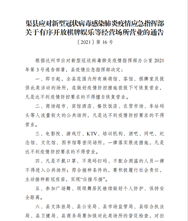 渠县关于有序开放棋牌娱乐等经营场所营业的通告 字体:大 小 打印 关闭本页 作者:渠县应对新型冠状病毒感染肺炎疫情应急指挥部 来源:本站原创 发布时间:2021-08-15 11:20:07 点击数: 扫一扫下载渠县网APP 分享 分享到: