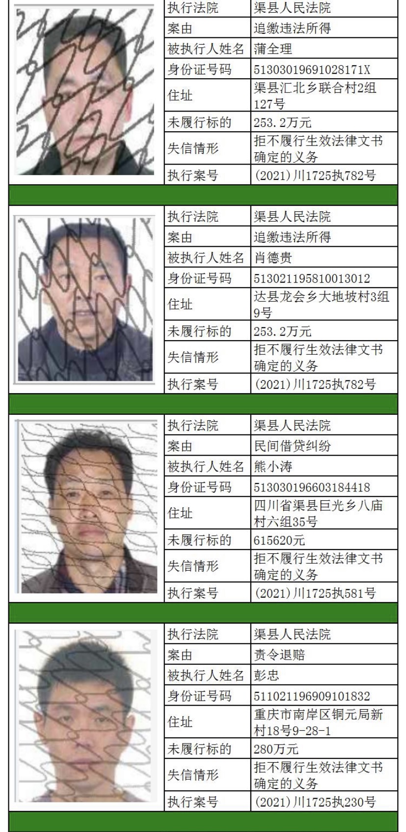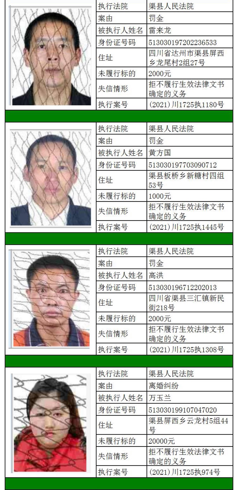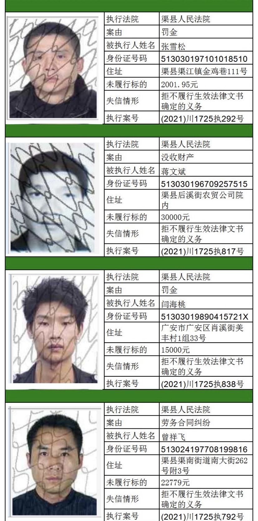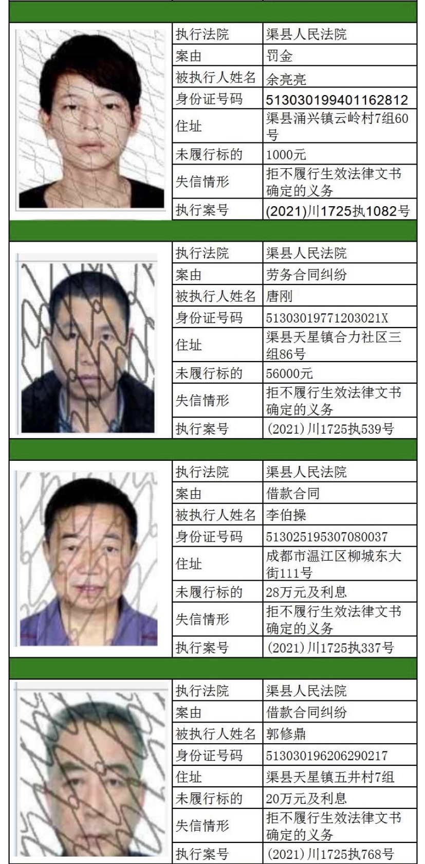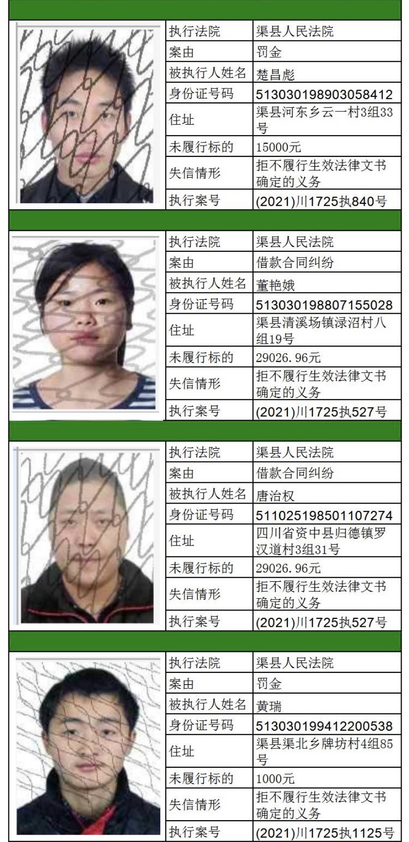 四、下列被执行人因违反财产报告制度,已经纳入失信被执行人名单,但仍不履行义务且拒不到案,拟予罚款、拘留。渠县人民法院严厉敦促其自本通告发布之日起十五日内主动归案,到案后能够配合法院执行、积极履行义务的,将从轻处罚或免予处罚。对拒不归案、继续逃匿、躲避执行的,渠县人民法院将联合相关部门采取有力措施缉拿归案,并依法从严从重惩处,直至追究刑事责任。