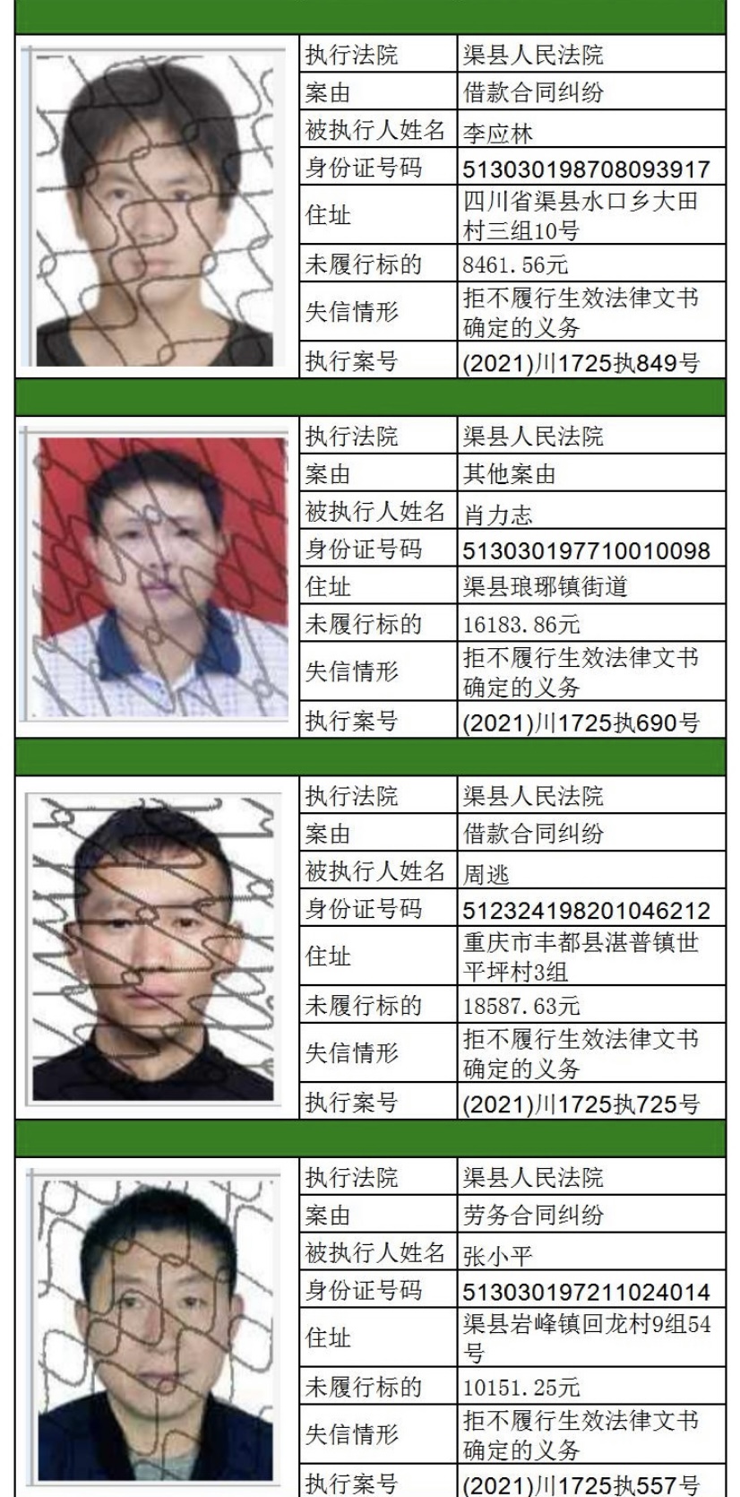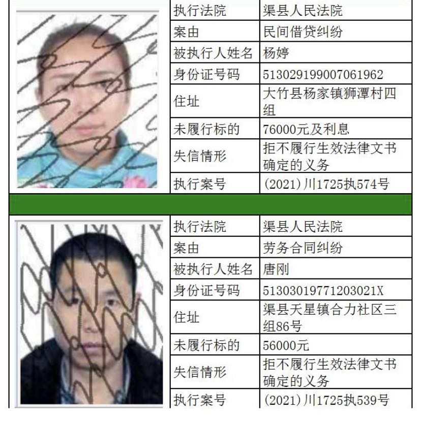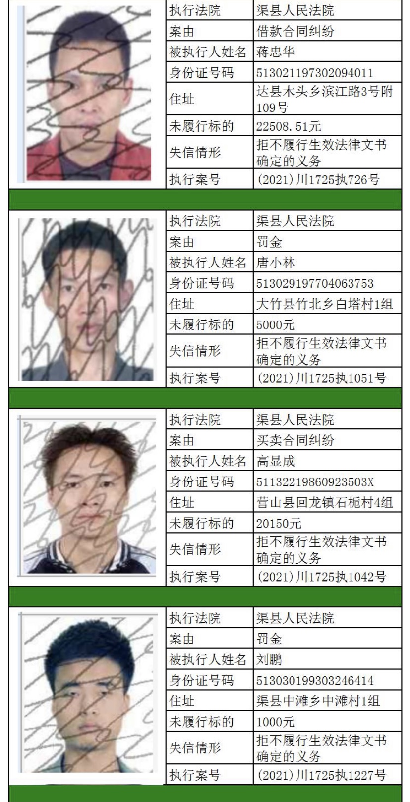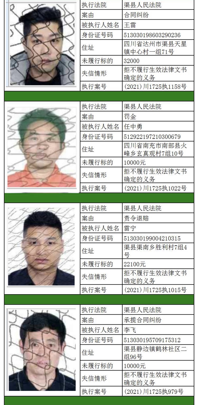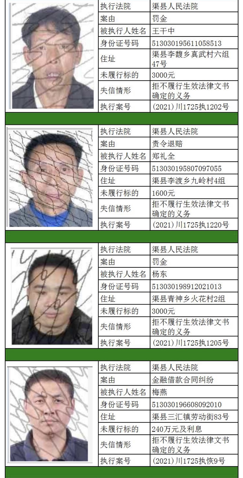 四、下列被执行人因违反财产报告制度,已经纳入失信被执行人名单,但仍不履行义务且拒不到案,拟予罚款、拘留。渠县人民法院严厉敦促其自本通告发布之日起十五日内主动归案,到案后能够配合法院执行、积极履行义务的,将从轻处罚或免予处罚。对拒不归案、继续逃匿、躲避执行的,渠县人民法院将联合相关部门采取有力措施缉拿归案,并依法从严从重惩处,直至追究刑事责任。
