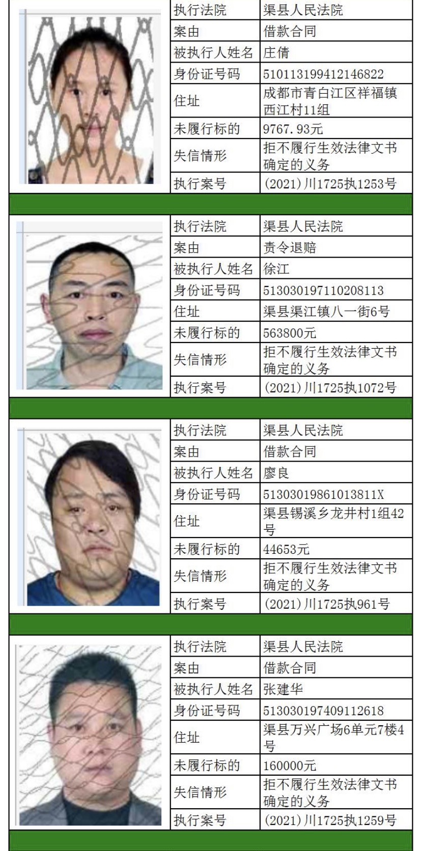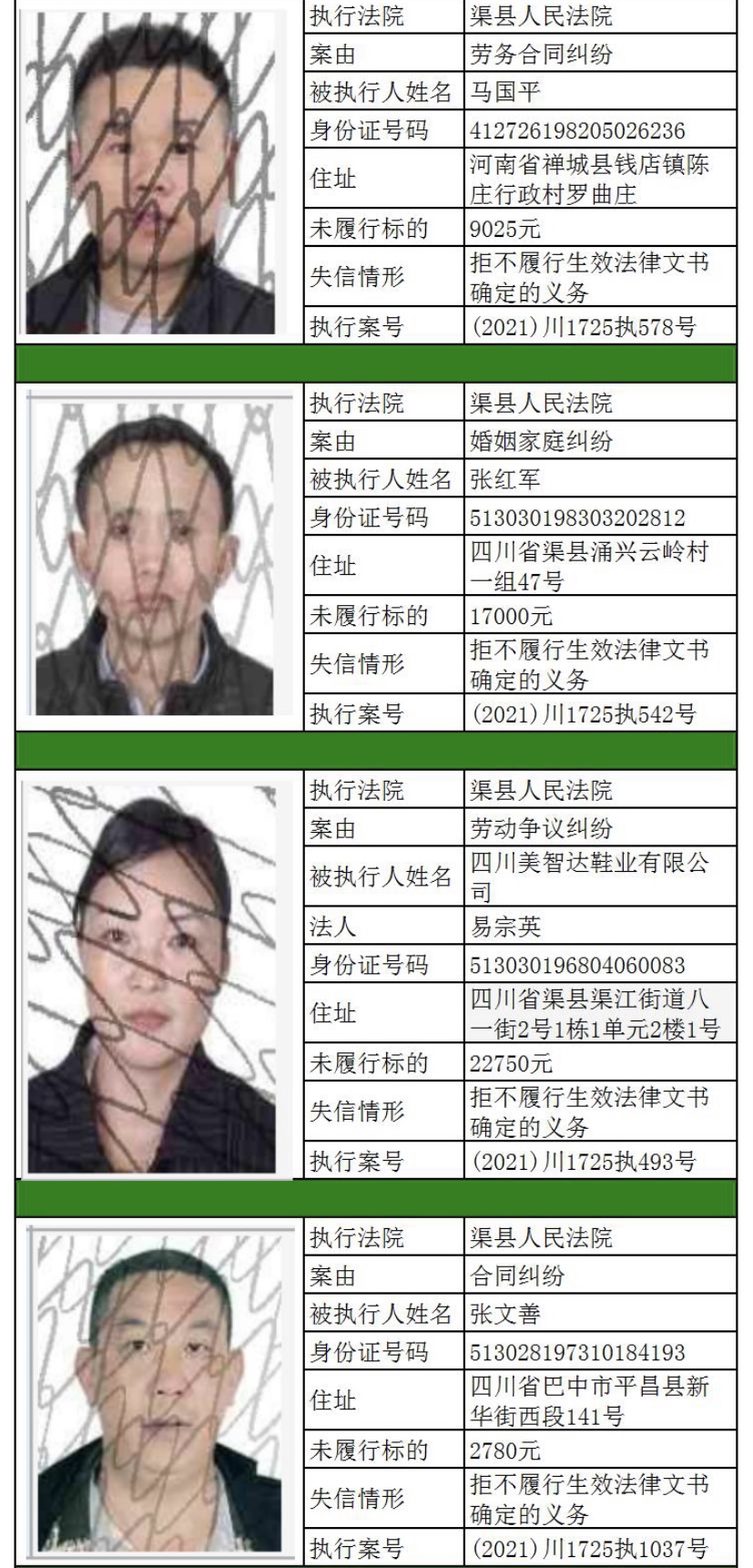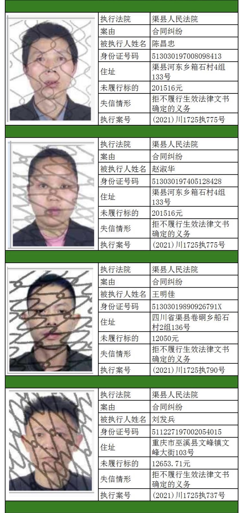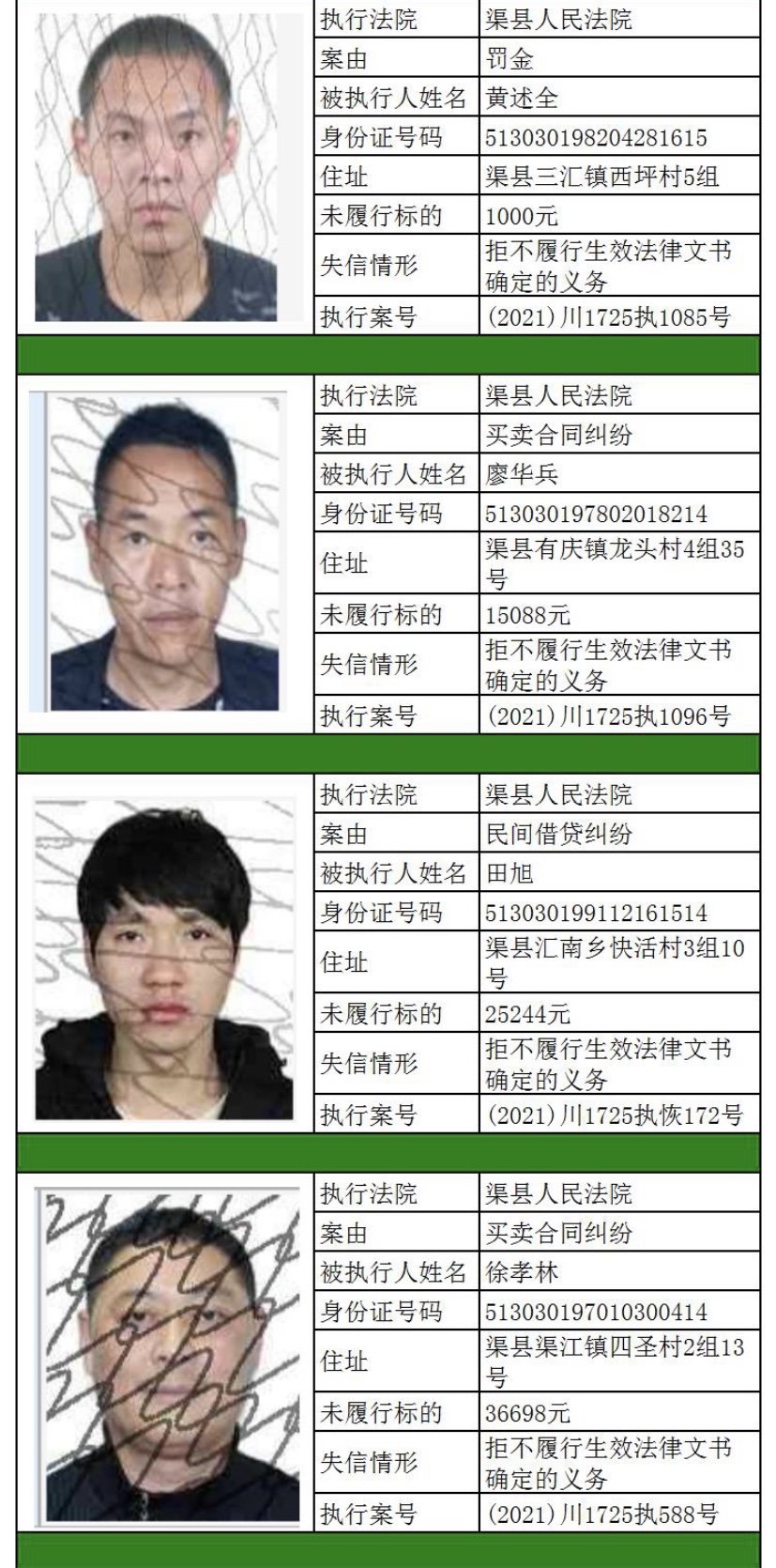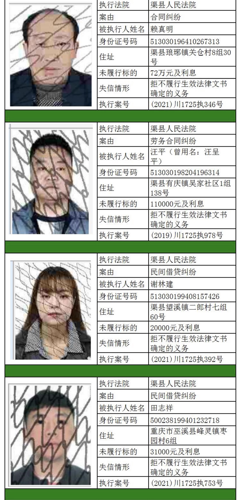 五、渠县人民法院郑重劝诫和告诫各类案件的被执行人,诚信是立足之本,守法是做人底线,人民法院生效法律文书确定的义务必须自觉履行,采取任何方式规避、逃避、抗拒执行的,将会付出更大的经济成本和代价。