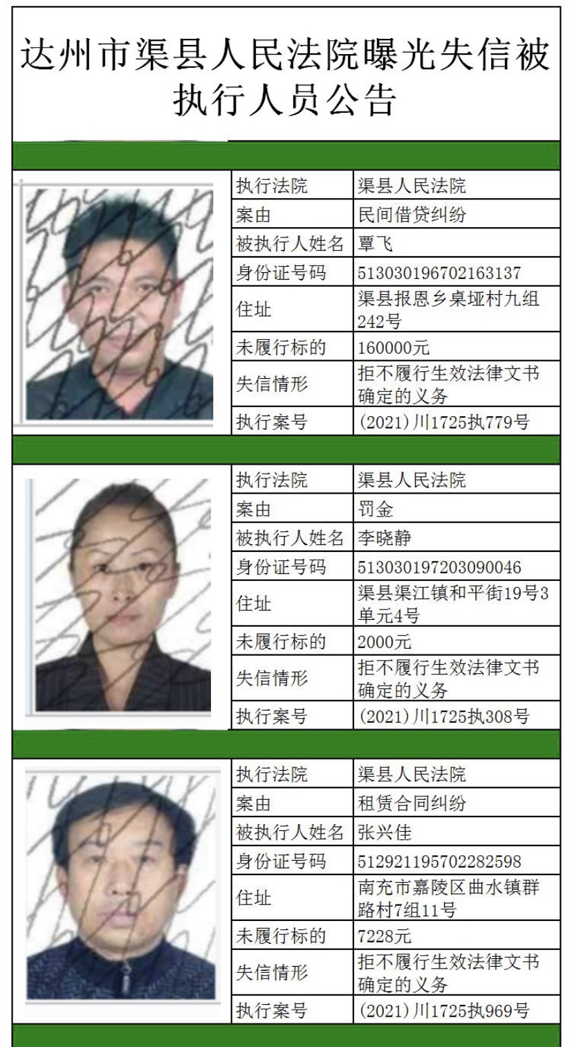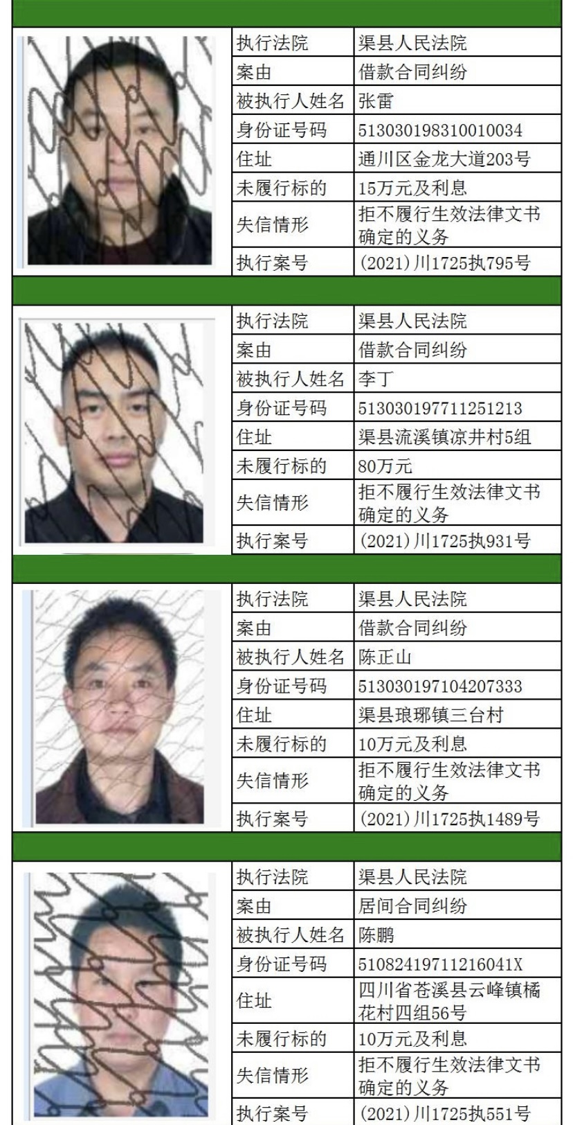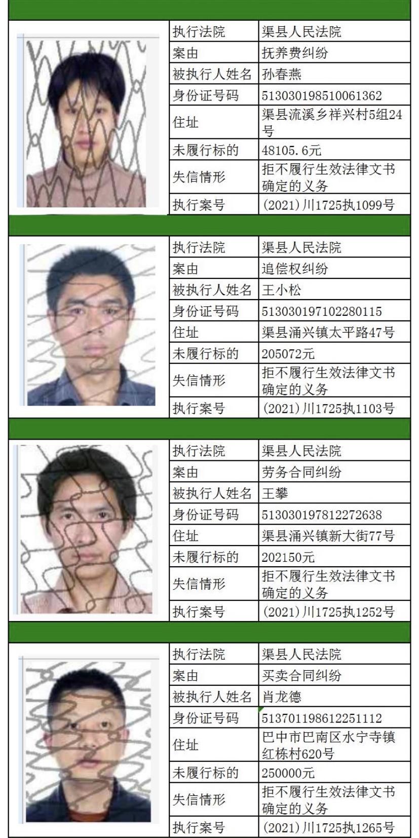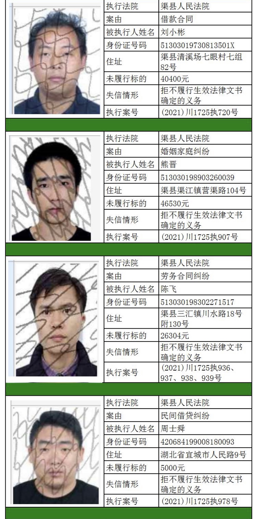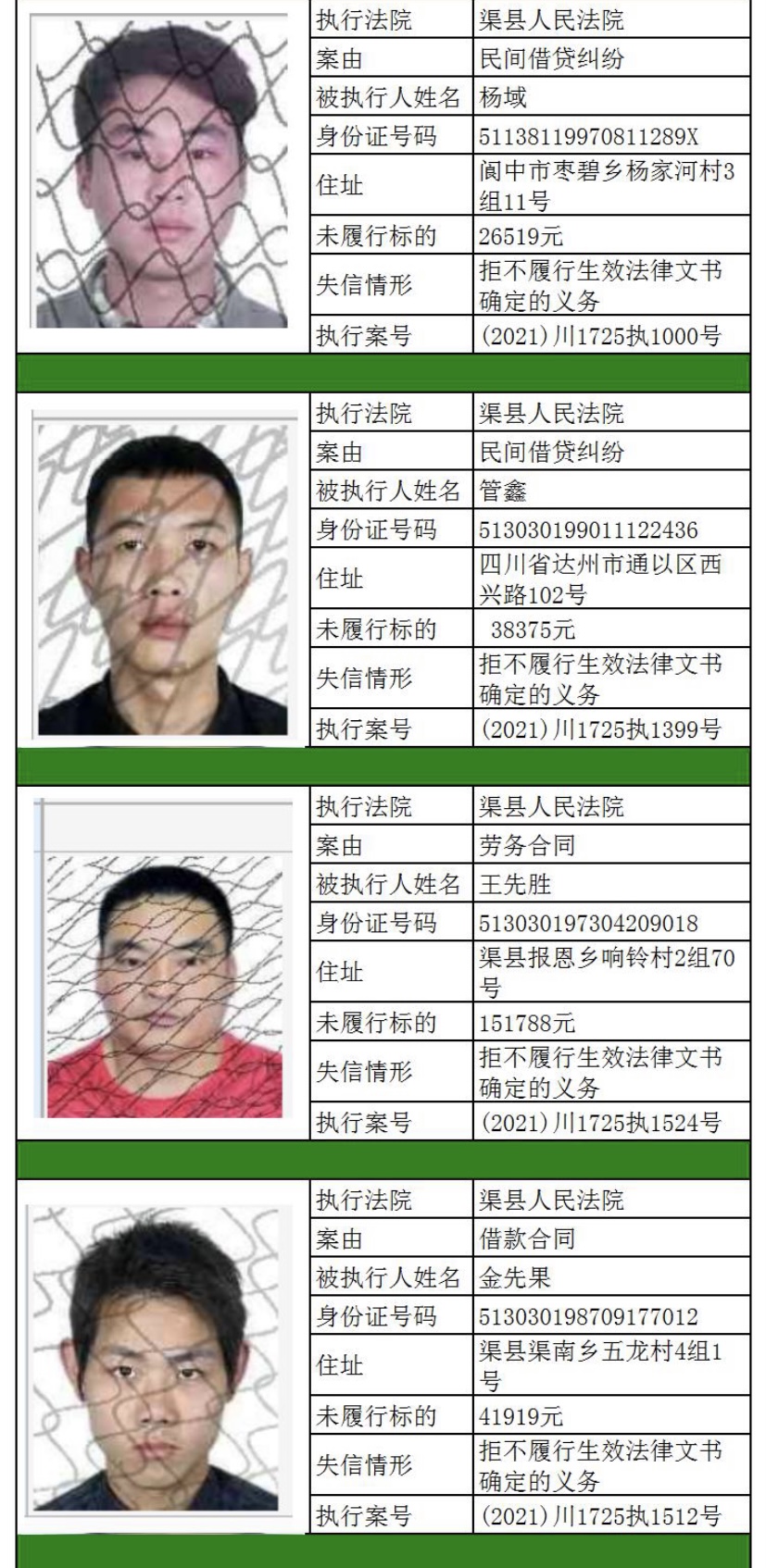 五、渠县人民法院郑重劝诫和告诫各类案件的被执行人,诚信是立足之本,守法是做人底线,人民法院生效法律文书确定的义务必须自觉履行,采取任何方式规避、逃避、抗拒执行的,将会付出更大的经济成本和代价。