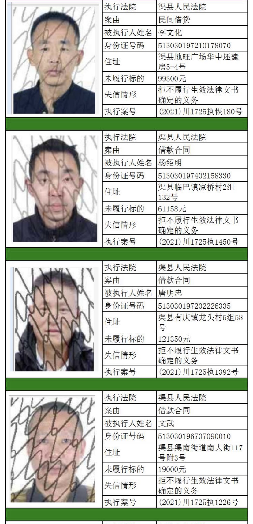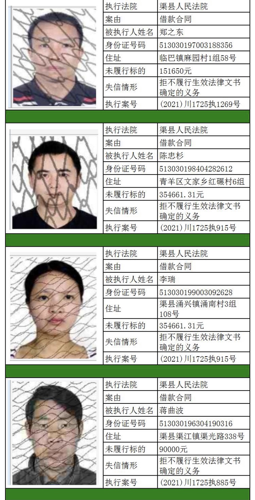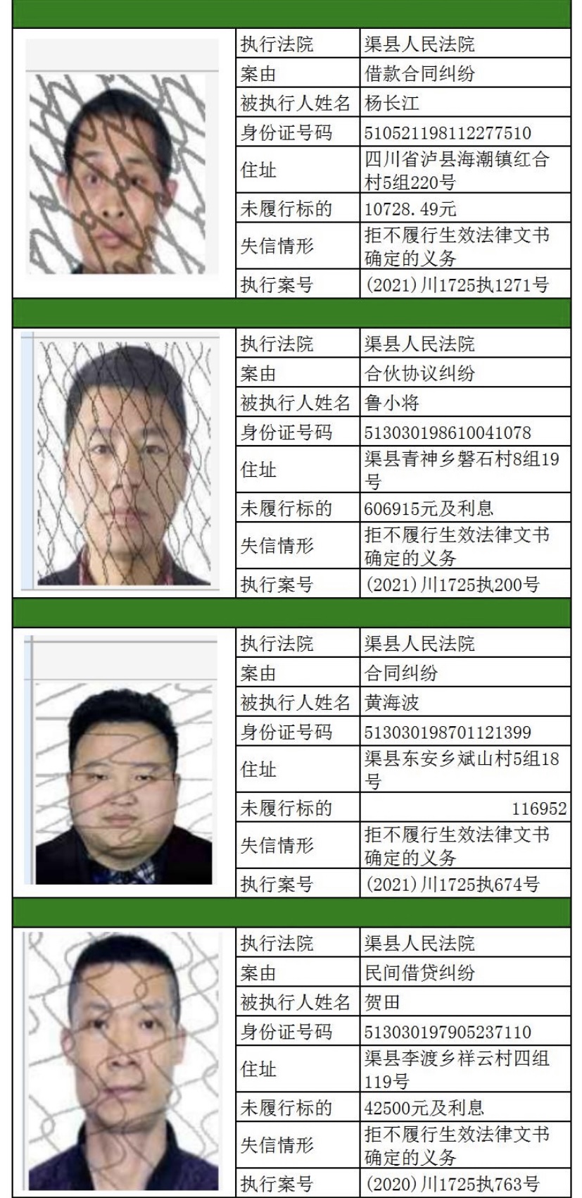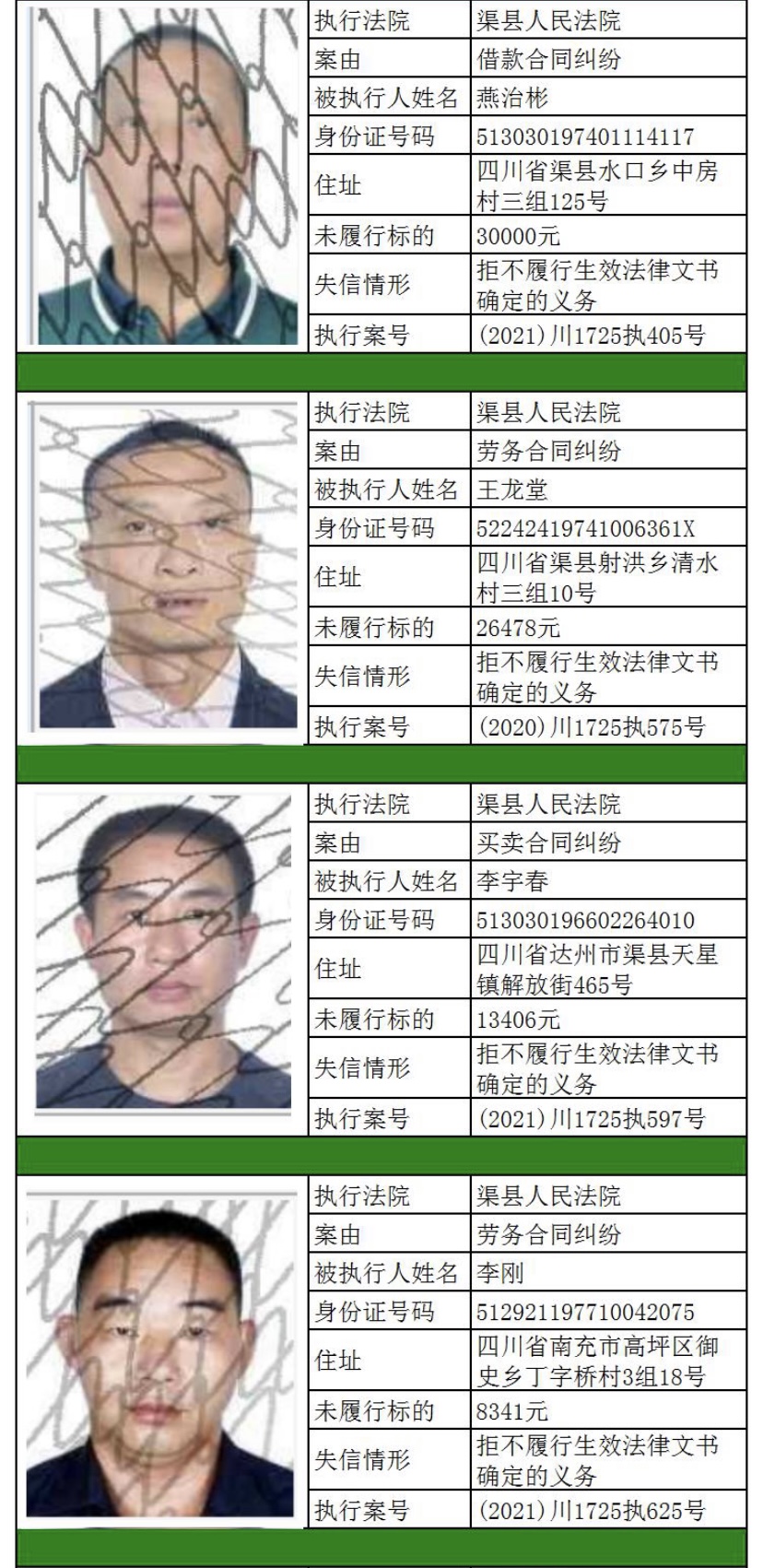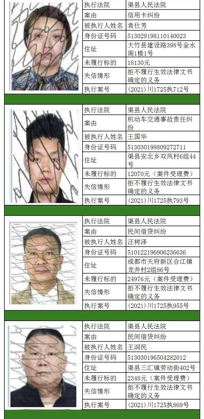 五、渠县人民法院郑重劝诫和告诫各类案件的被执行人,诚信是立足之本,守法是做人底线,人民法院生效法律文书确定的义务必须自觉履行,采取任何方式规避、逃避、抗拒执行的,将会付出更大的经济成本和代价。