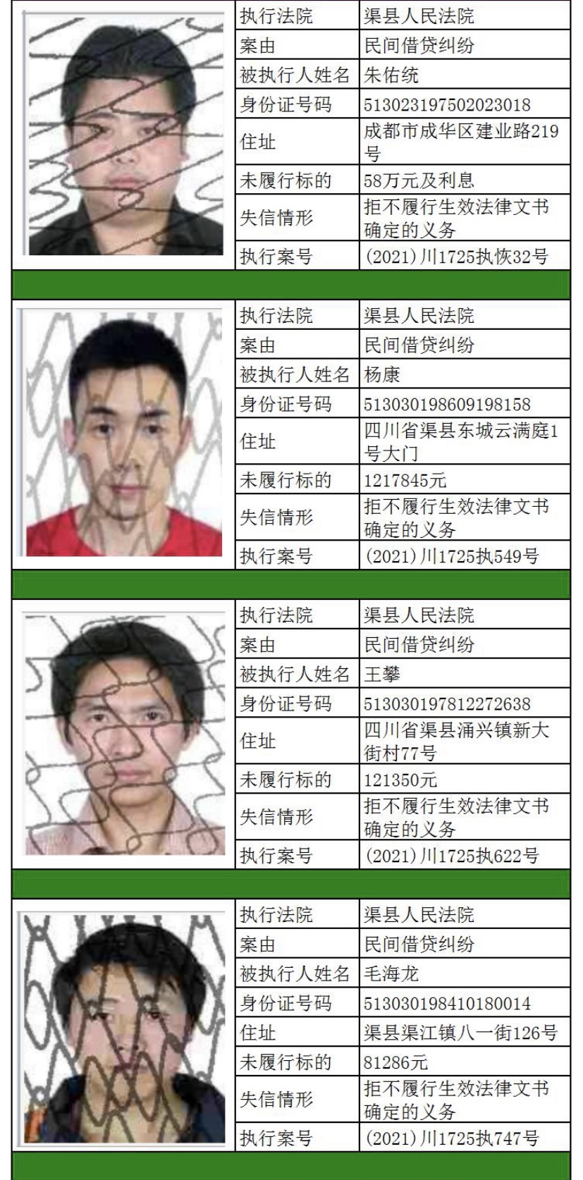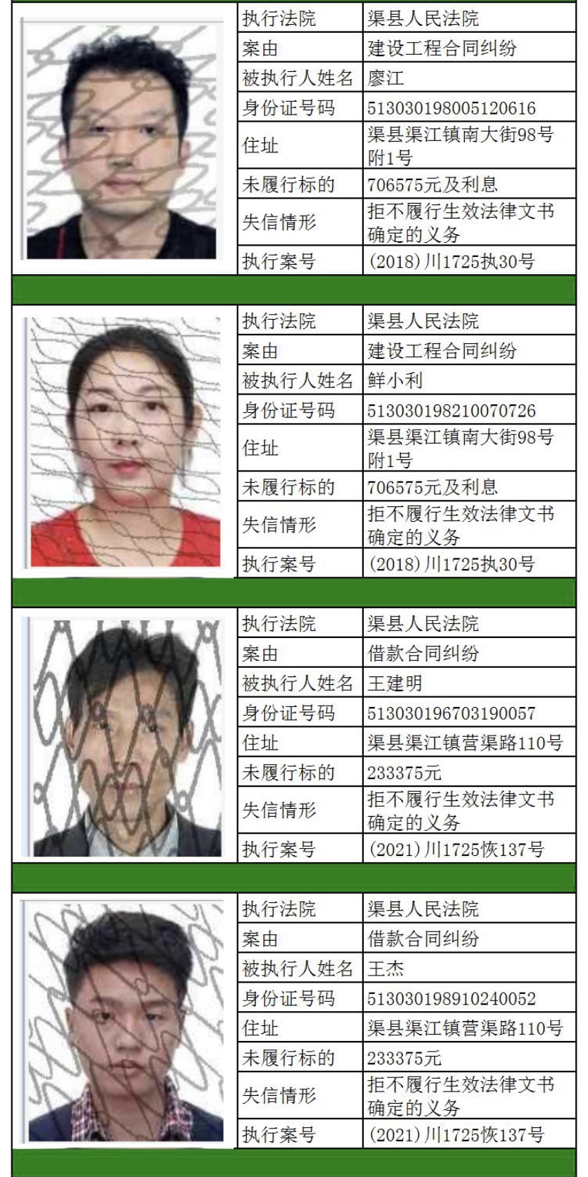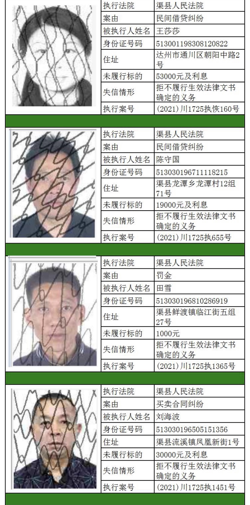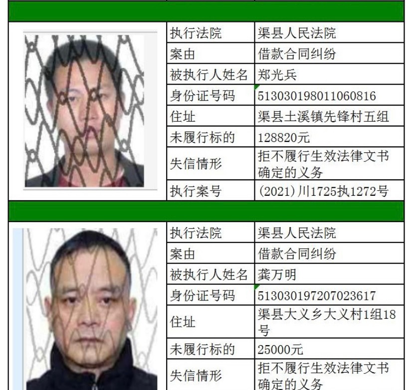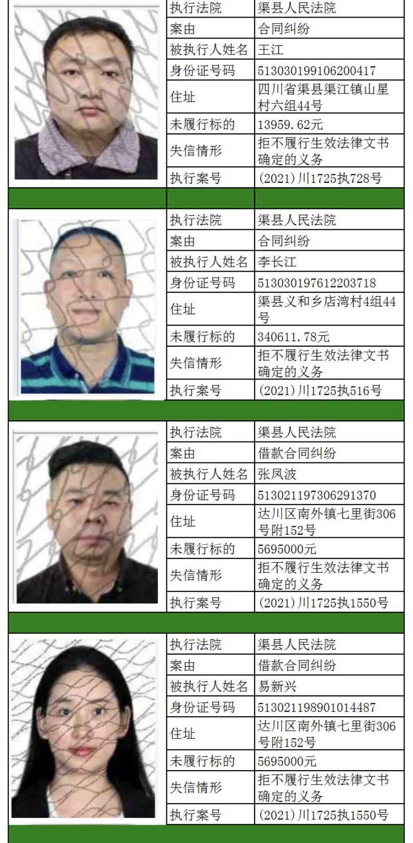 五、渠县人民法院郑重劝诫和告诫各类案件的被执行人,诚信是立足之本,守法是做人底线,人民法院生效法律文书确定的义务必须自觉履行,采取任何方式规避、逃避、抗拒执行的,将会付出更大的经济成本和代价。