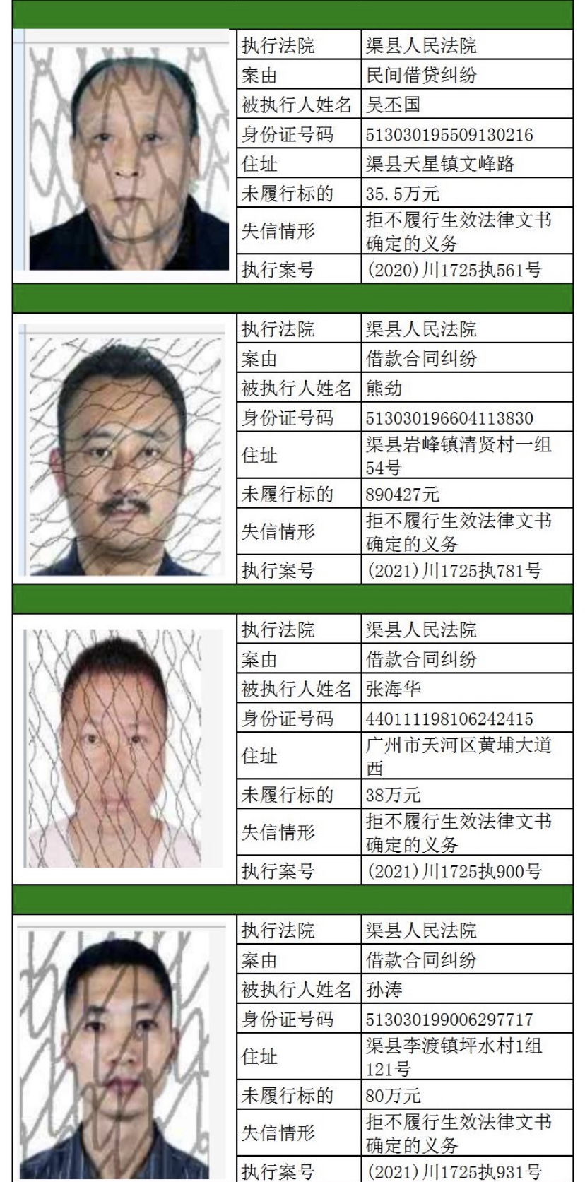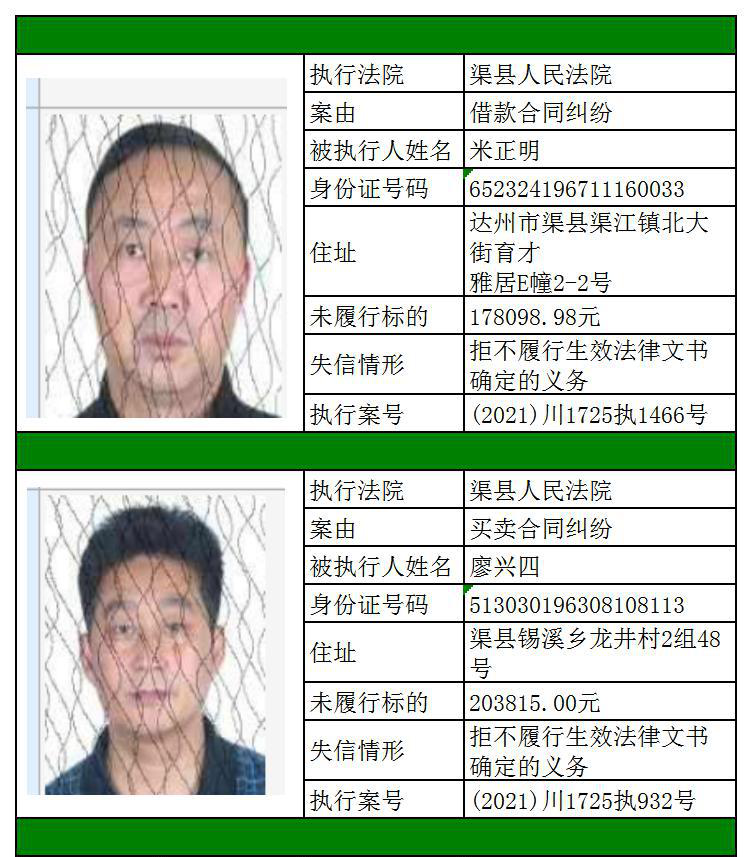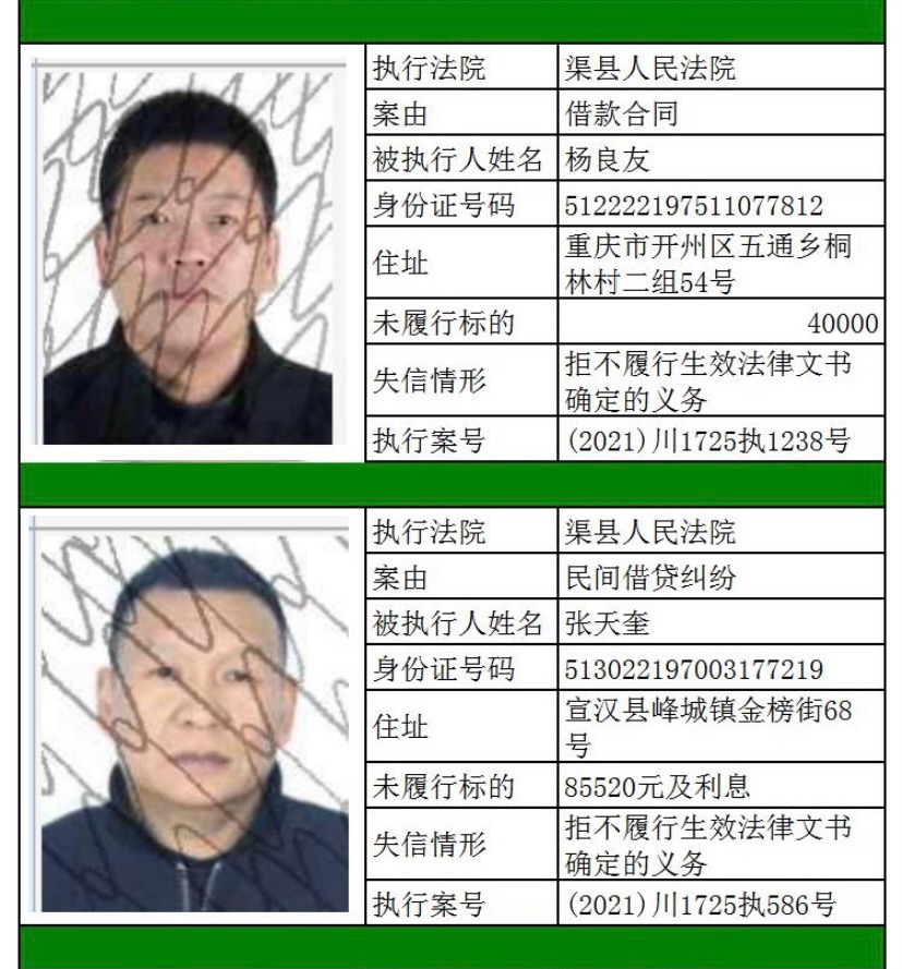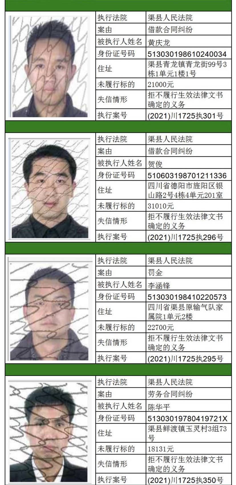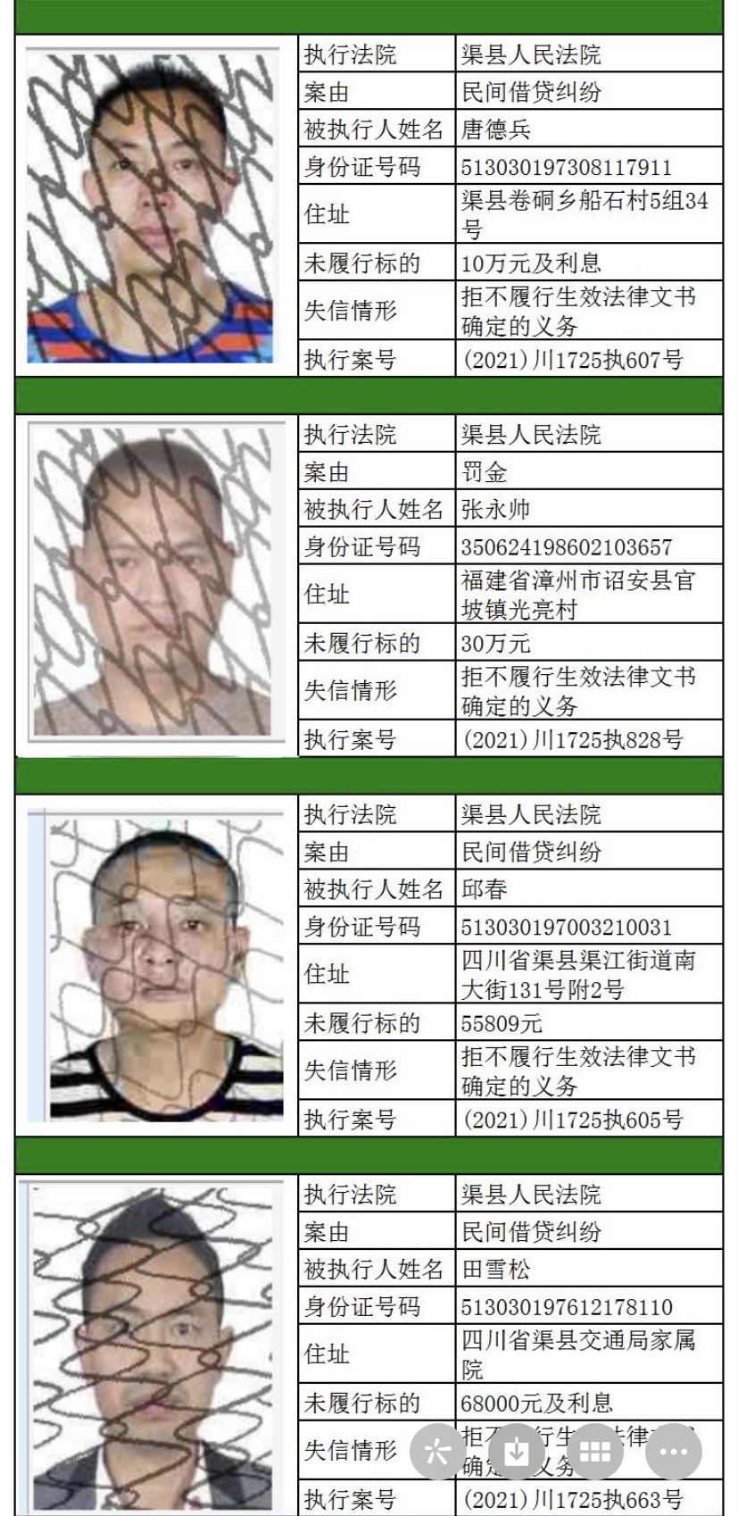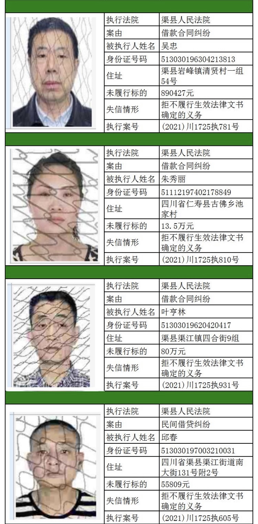 五、渠县人民法院郑重劝诫和告诫各类案件的被执行人,诚信是立足之本,守法是做人底线,人民法院生效法律文书确定的义务必须自觉履行,采取任何方式规避、逃避、抗拒执行的,将会付出更大的经济成本和代价。