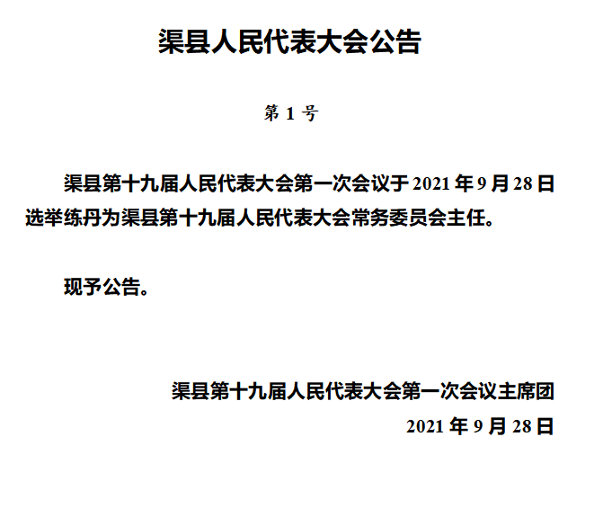 渠县人民代表大会公告(第1号) 字体:大 小 打印 关闭本页 作者:渠县第十九届人民代表大会第一次会议主席团 来源:本站原创 发布时间:2021-09-28 20:19:00 点击数: 扫一扫下载渠县网APP 分享 分享到: