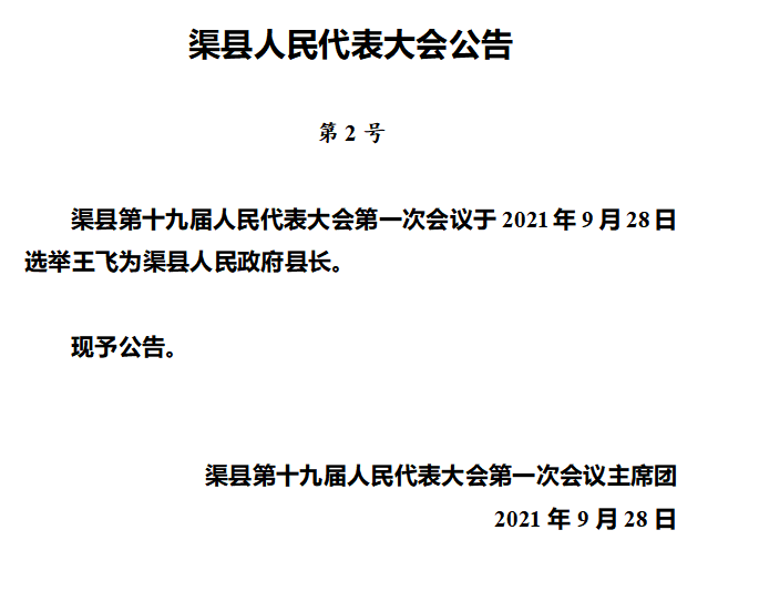渠县人民代表大会公告(第2号) 字体:大 小 打印 关闭本页 作者:渠县第十九届人民代表大会第一次会议主席团 来源:本站原创 发布时间:2021-09-28 20:21:03 点击数: 扫一扫下载渠县网APP 分享 分享到: