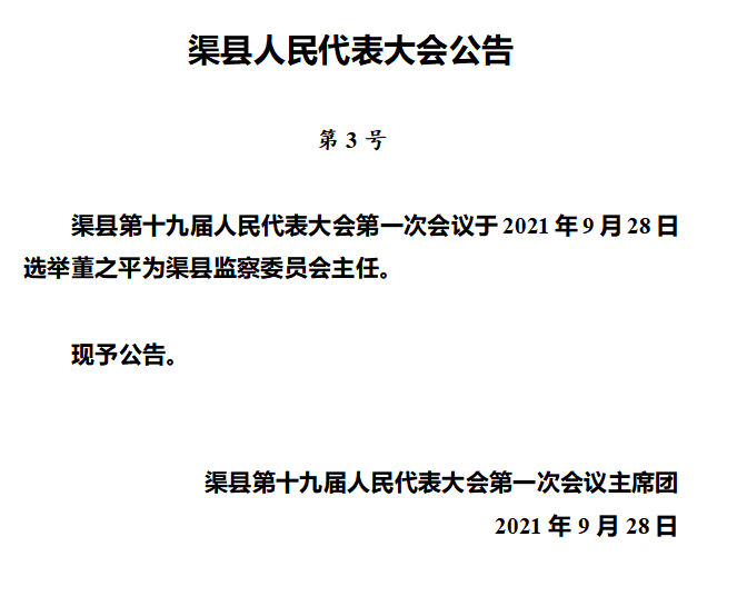 渠县人民代表大会公告(第3号) 字体:大 小 打印 关闭本页 作者:渠县第十九届人民代表大会第一次会议主席团 来源:本站原创 发布时间:2021-09-28 20:22:01 点击数: 扫一扫下载渠县网APP 分享 分享到: