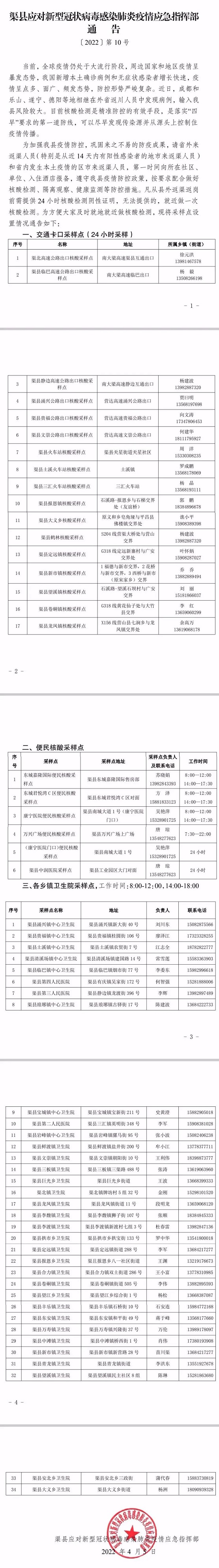渠县应对新型冠状病毒感染肺炎疫情应急指挥部发布第10号通告 字体:大 小 打印 关闭本页 作者: 来源:本站原创 发布时间:2022-04-05 19:44:22 点击数: 扫一扫下载渠县网APP 分享 分享到: 为方便广大群众及时就地就近核酸检测4月5日渠县应对新型冠状病毒感染肺炎疫情应急指挥部发布第10号通告再次公布全县各地核酸采样点详情如下