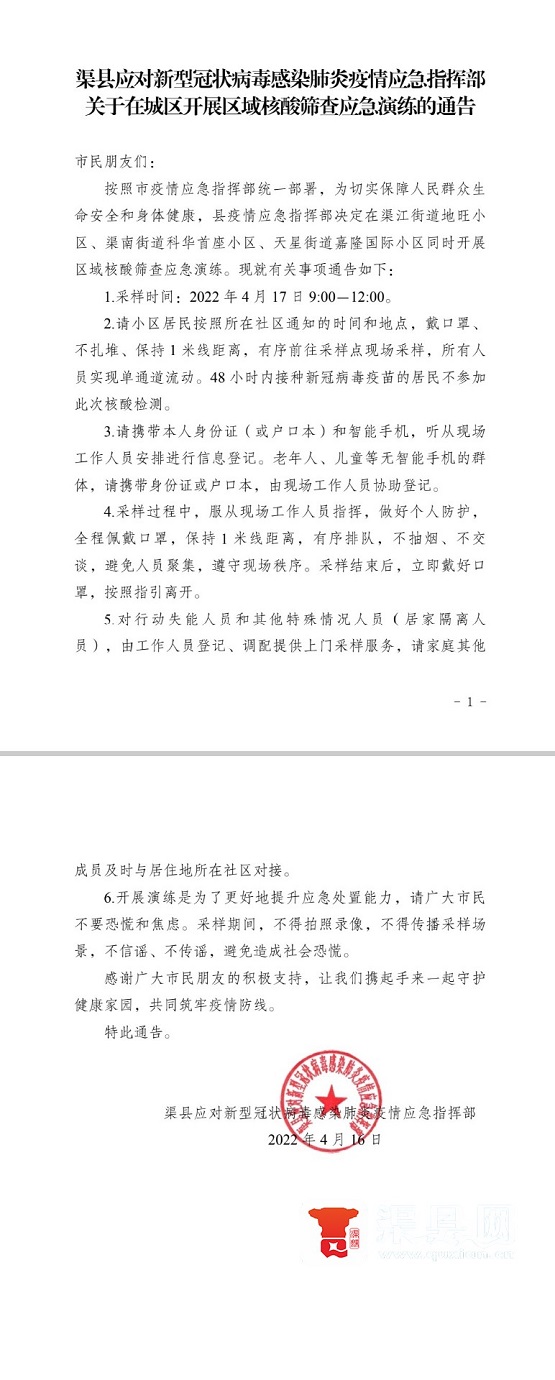 关于在城区开展区域核酸筛查应急演练的通告 字体:大 小 打印 关闭本页 作者:渠县应对新型冠状病毒感染肺炎疫情应急指挥部 来源:本站原创 发布时间:2022-04-16 18:24:01 点击数: 扫一扫下载渠县网APP 分享 分享到: