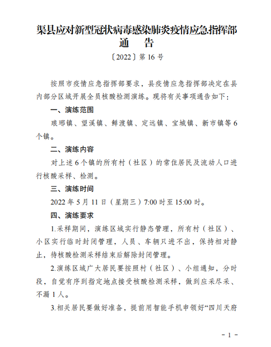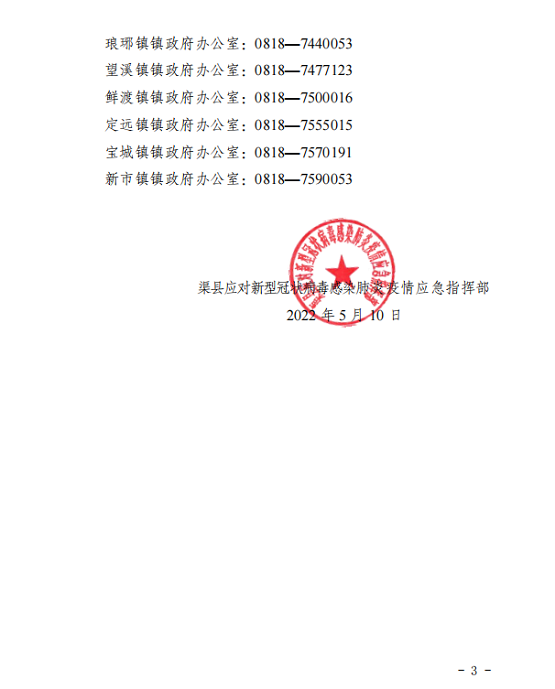 渠县应对新型冠状病毒感染肺炎疫情应急指挥部通告〔2022〕第16号 字体:大 小 打印 关闭本页 作者:渠县应对新型冠状病毒感染肺炎疫情应急指挥部 来源:本站原创 发布时间:2022-05-10 16:14:37 点击数: 扫一扫下载渠县网APP 分享 分享到:
