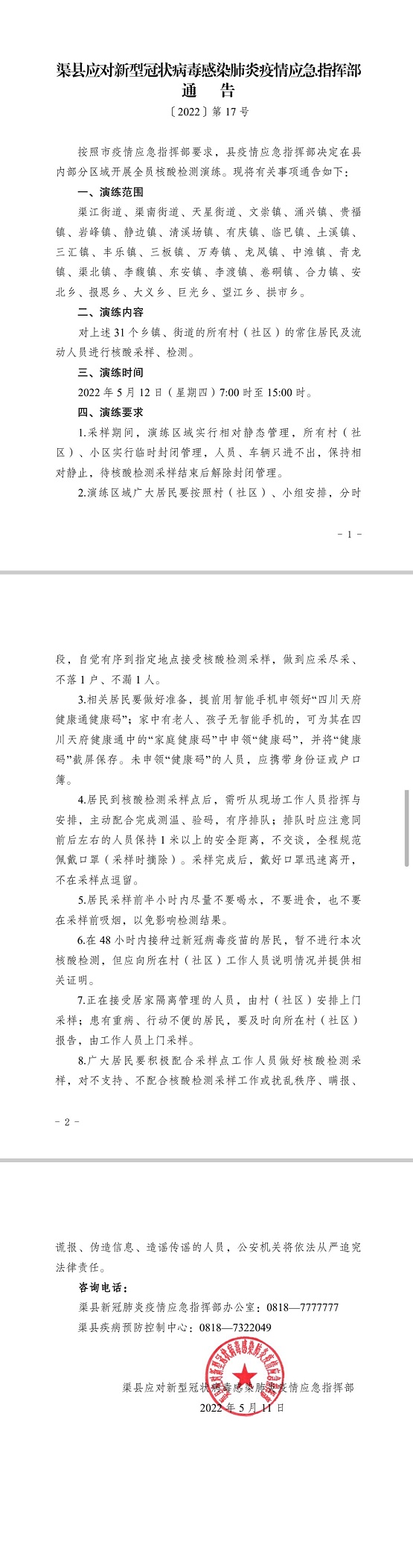 渠县应对新型冠状病毒感染肺炎疫情应急指挥部通告〔2022〕第17号 字体:大 小 打印 关闭本页 作者:渠县应对新型冠状病毒感染肺炎疫情应急指挥部 来源:本站原创 发布时间:2022-05-12 16:18:11 点击数: 扫一扫下载渠县网APP 分享 分享到: