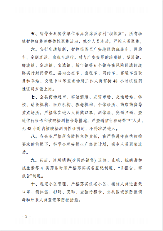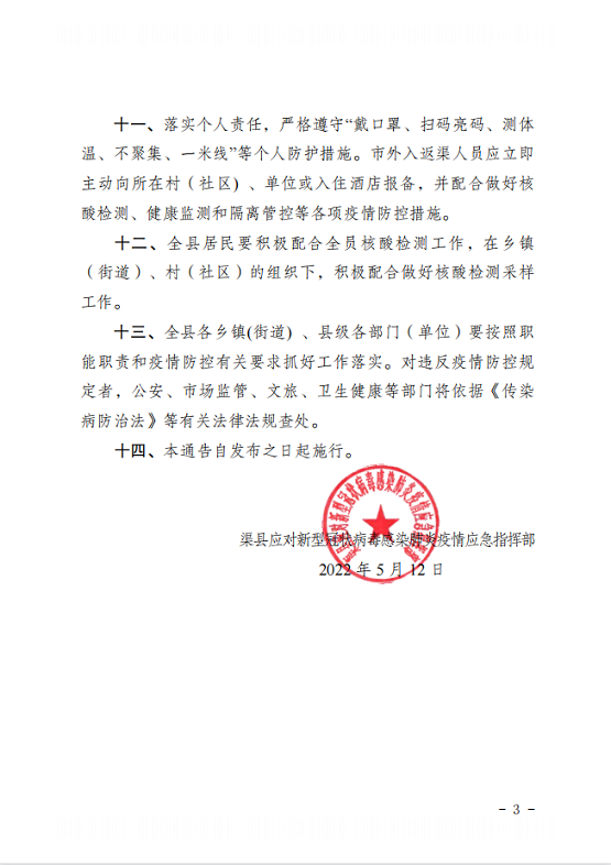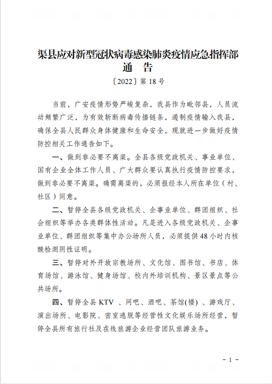 渠县应对新型冠状病毒感染肺炎疫情应急指挥部通告〔2022〕第18号 字体:大 小 打印 关闭本页 作者:渠县应对新型冠状病毒感染肺炎疫情应急指挥部 来源:本站原创 发布时间:2022-05-12 20:48:22 点击数: 扫一扫下载渠县网APP 分享 分享到: