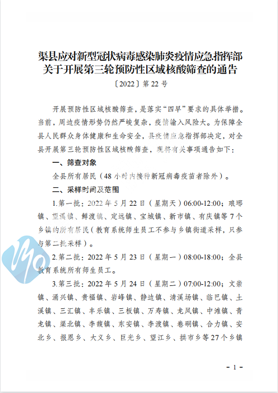 关于开展第三轮预防性区域核酸筛查的通告(不临时管控,分四批进行)第22号通告 字体:大 小 打印 关闭本页 作者:渠县应对新型冠状病毒感染肺炎疫情应急指挥部 来源:本站原创 发布时间:2022-05-22 20:49:44 点击数: 扫一扫下载渠县网APP 分享 分享到: