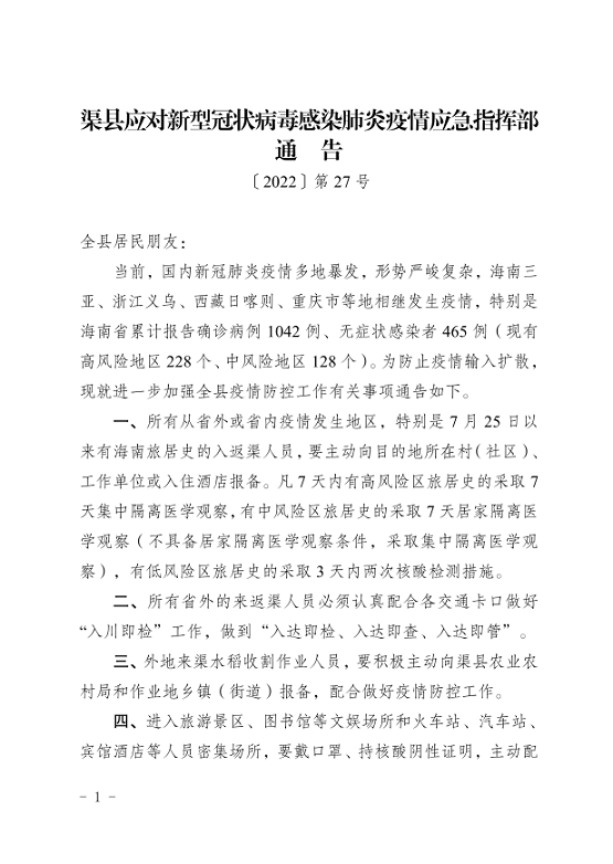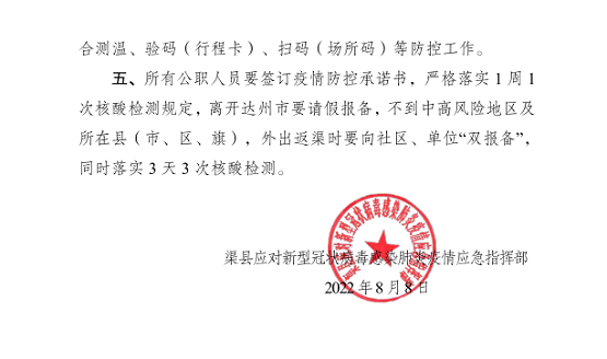 渠县应对新型冠状病毒肺炎疫情应急指挥部通告〔2022〕第27号 字体:大 小 打印 关闭本页 作者:渠县应对新型冠状病毒感染肺炎疫情应急指挥部 来源:本站原创 发布时间:2022-08-09 11:08:50 点击数: 扫一扫下载渠县网APP 分享 分享到: