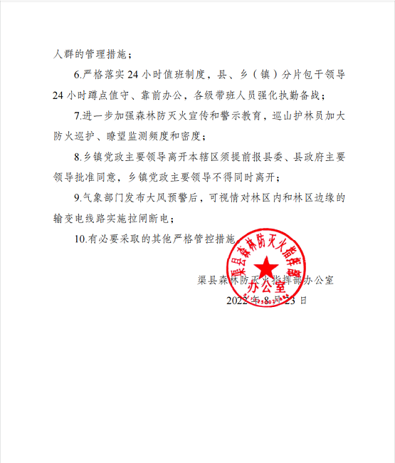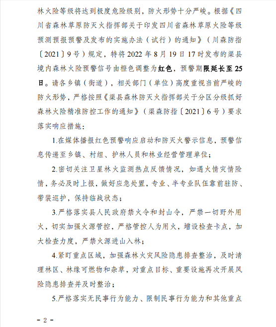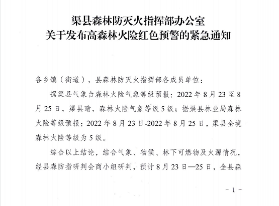 渠县森林防灭火指挥部办公室关于发布高森林火险红色预警的紧急通知 字体:大 小 打印 关闭本页 作者:渠县森林防灭火指挥部办公室 来源:本站原创 发布时间:2022-08-23 12:09:03 点击数: 扫一扫下载渠县网APP 分享 分享到: