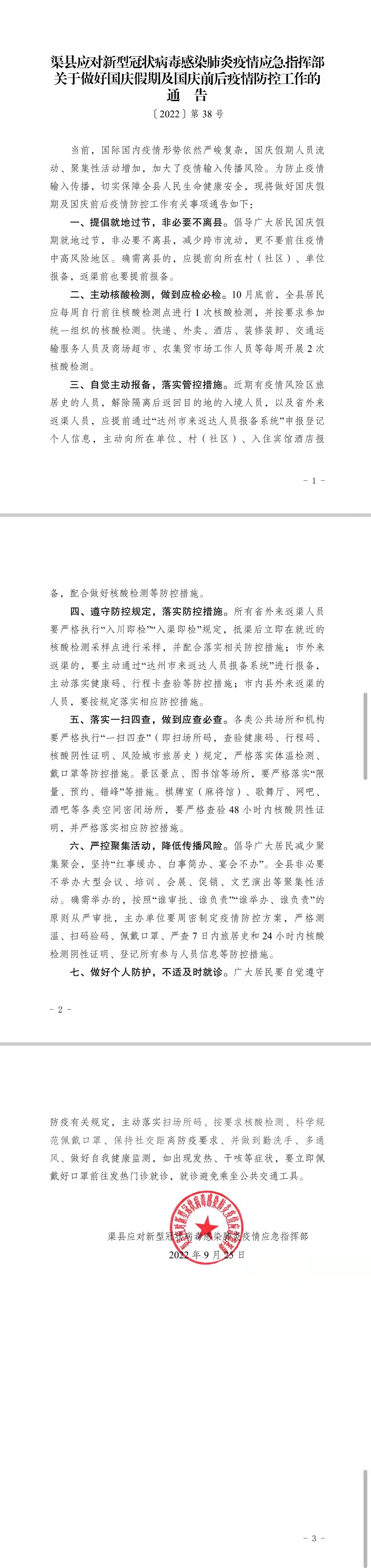 第38号!渠县关于做好国庆假期及国庆前后疫情防控工作的通告 字体:大 小 打印 关闭本页 作者:渠县融媒体中心 来源:本站原创 发布时间:2022-09-26 10:08:09 点击数: 扫一扫下载渠县网APP 分享 分享到: