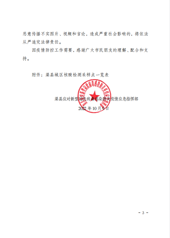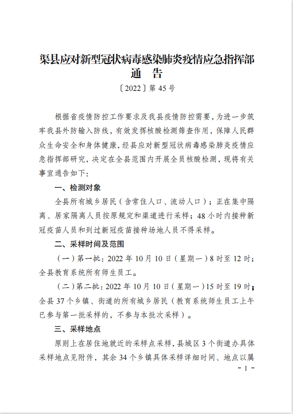第45号!渠县疫情指挥部关于开展全员核酸检测的通告 字体:大 小 打印 关闭本页 作者:渠县融媒体中心 来源:本站原创 发布时间:2022-10-10 02:09:34 点击数: 扫一扫下载渠县网APP 分享 分享到: