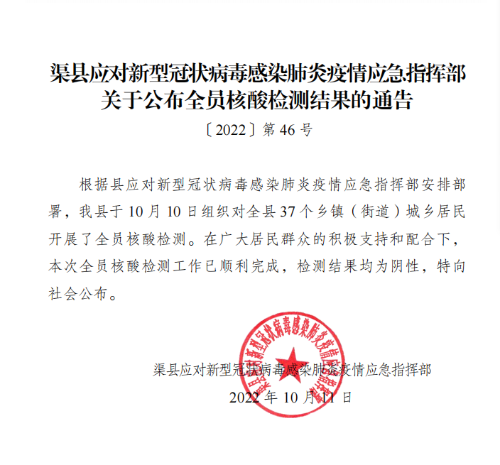 第46号!全部阴性!渠县疫情指挥部关于全员核酸检测结果的通告 字体:大 小 打印 关闭本页 作者:渠县融媒体中心 来源:本站原创 发布时间:2022-10-11 12:26:54 点击数: 扫一扫下载渠县网APP 分享 分享到: