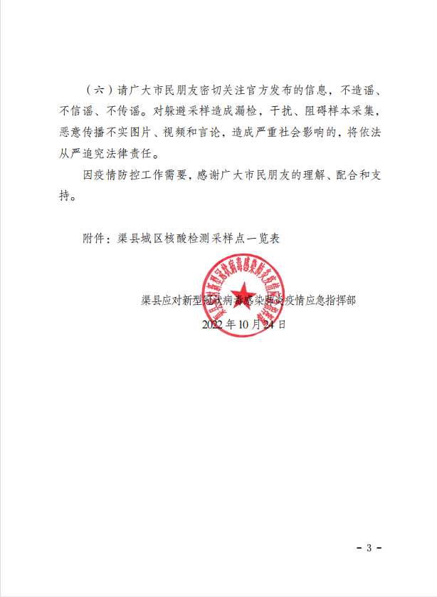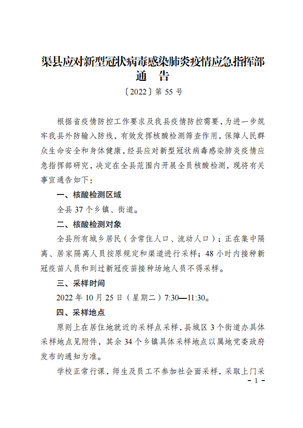 第55号!渠县疫情指挥部关于开展区域核酸检测的通告 字体:大 小 打印 关闭本页 作者:渠县融媒体中心 来源:本站原创 发布时间:2022-10-24 18:49:33 点击数: 扫一扫下载渠县网APP 分享 分享到: